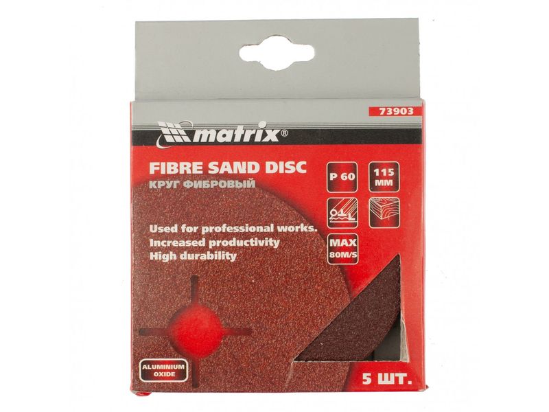 Фибровый круг Matrix 73903 размером 115 х 22 мм, с абразивом P 60, 5 шт. в упаковке, устанавливается на углошлифовальную машину (УШМ) при помощи опорной тарелки для фибровых кругов. Крупнозернистый абразив Р 60 используется для грубой обработки металлических, каменных и деревянных изделий, позволяет снимать старые лакокрасочные покрытия, удалять заусенцы и сварные швы, следы ржавчины и потертости. Благодаря прочной основе ресурс у фибровых кругов в 2-3 раза больше, чем у шлифкругов «под липучку».