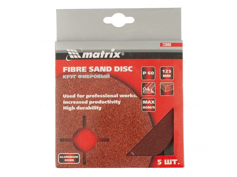 Фибровый круг Matrix 73909 размером 125 х 22 мм, с абразивом P 60, 5 шт. в упаковке, устанавливается на углошлифовальную машину (УШМ) при помощи опорной тарелки для фибровых кругов. Крупнозернистый абразив Р 60 используется для грубой обработки металлических, каменных и деревянных изделий, позволяет снимать старые лакокрасочные покрытия, удалять заусенцы и сварные швы, следы ржавчины и потертости. Благодаря прочной основе ресурс у фибровых кругов в 2-3 раза больше, чем у шлифкругов «под липучку».