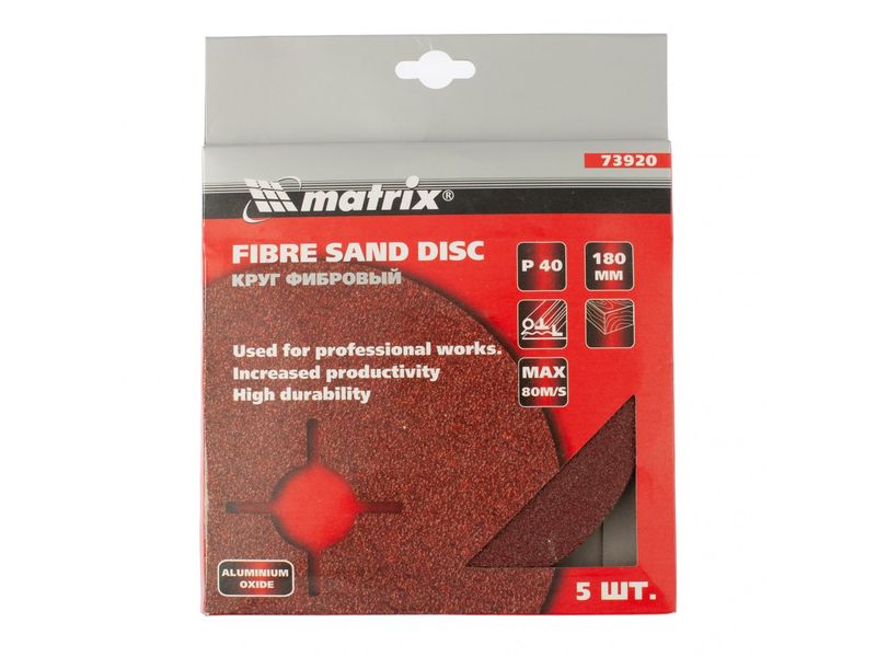 Фибровый круг Matrix 73920 размером 180 х 22 мм, с абразивом P 40, 5 шт. в упаковке, устанавливается на углошлифовальную машину (УШМ) при помощи опорной тарелки для фибровых кругов. Крупнозернистый абразив Р 40 используется для грубой обработки металлических, каменных и деревянных изделий, позволяет удалять лак, краску, заусенцы, ржавчину, затирать швы и устранять брызги после сварки. Благодаря прочной основе ресурс у фибровых кругов в 2-3 раза больше, чем у шлифкругов «под липучку».
