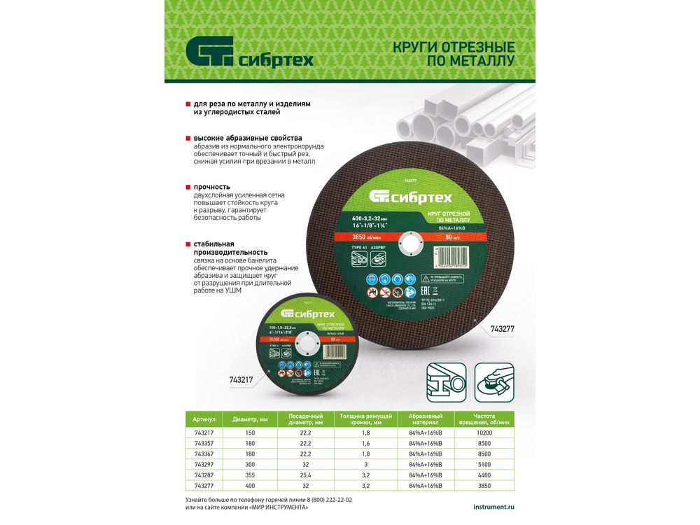 Отрезной круг по металлу Сибртех 84%A+16%B 743277 диаметром 400 мм и толщиной 3,2 мм устанавливается на фланец ручной углошлифовальной машины или станка с посадочным размером 32 мм. Предназначен для работы по металлу, оптимален для резания углеродистых сталей. Максимальная частота вращения составляет 4400 об/мин. Пригодится в мастерской, будет также полезен в быту.