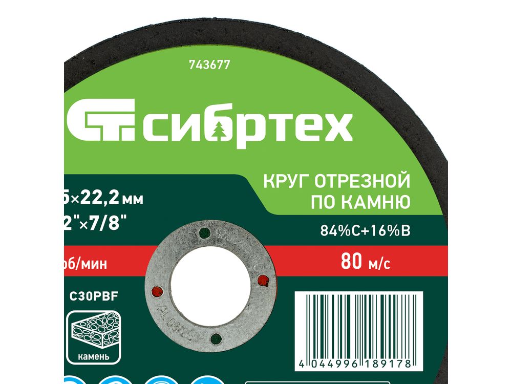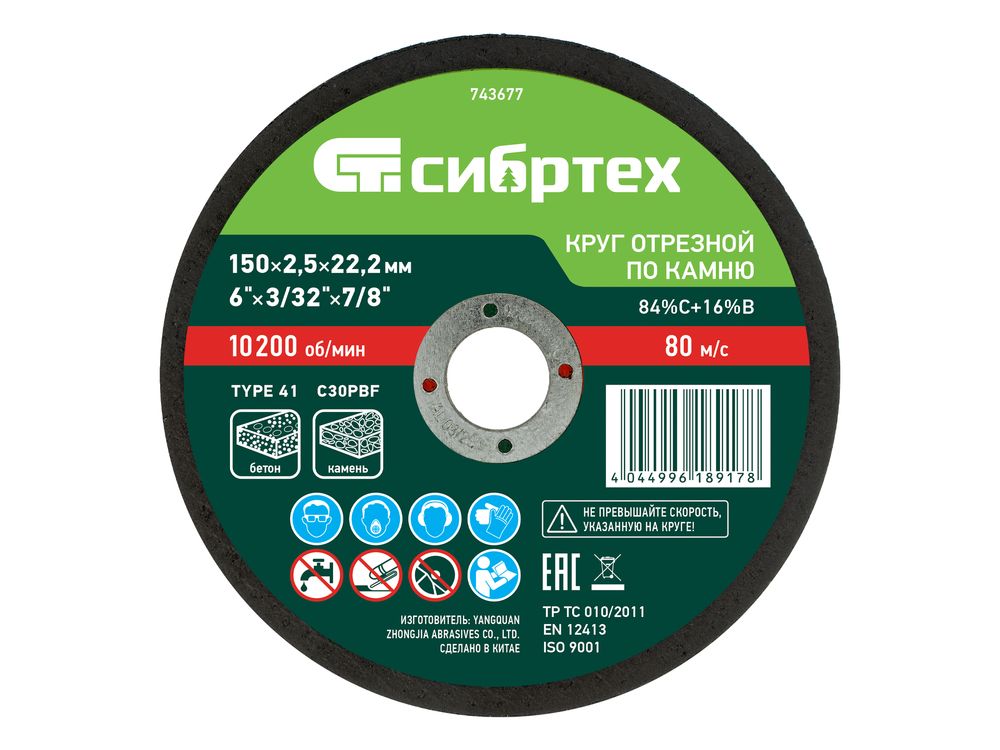 Отрезной круг по камню Сибртех 743677 размером 150 х 2,5 х 22,2 мм — оснастка для ручной углошлифовальной машины, предназначенная для реза камня, огнеупорного кирпича, бетонных изделий, керамической плитки. Использования смазочно-охлаждающих жидкостей не требуется. Пригодится в быту, частной мастерской или на небольшом производстве.