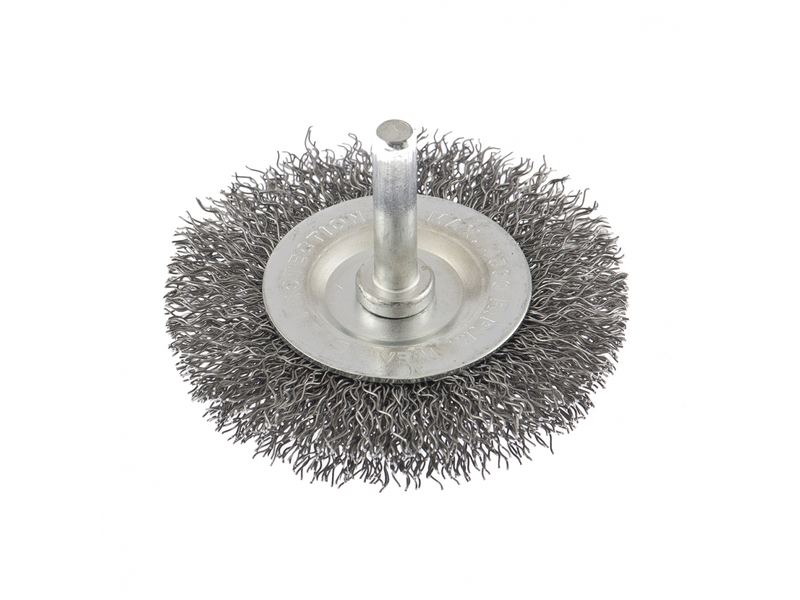 Плоская щетка для дрели Сибртех 744467 диаметром 60 мм, со шпилькой и щетиной из витой проволоки 0,3 мм, используется для щадящей обработки металлических, деревянных и пластиковых поверхностей. Удаляет загрязнения, ржавчину, старые лакокрасочные покрытия. Благодаря плоской форме щетка идеально подходит для очистки труднодоступных мест, пазов, изгибов, внутренних углов. Хвостовик диаметром 6 мм устанавливается в патрон дрели. Рекомендуемая скорость вращения 4500 об/мин. Во время работы следует использовать средства индивидуальной защиты. Щетку применяют во время строительства, ремонта, а также в быту.
