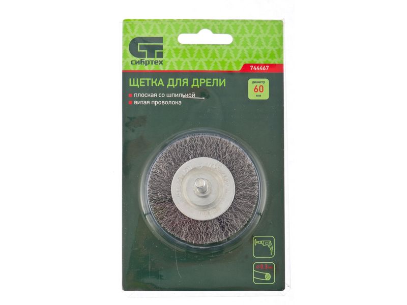 Щетка для дрели, 60 мм, плоская со шпилькой, витая проволока 0,3мм