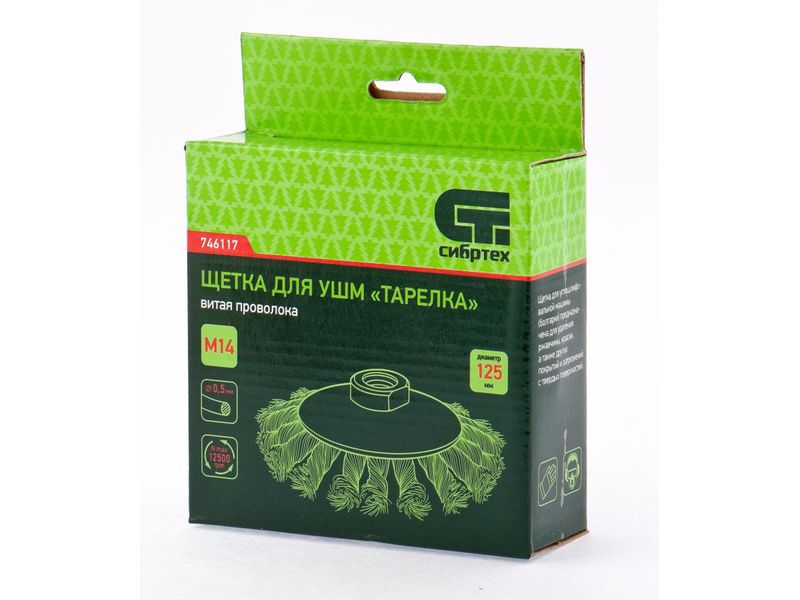 Щетка Сибртех «тарелка» 746117 диаметром 125 мм, с щетиной из крученой проволоки толщиной 0,5 мм, устанавливается на УШМ при помощи гайки М14. Выполнена в форме тарелки, за счет чего подходит для грубой (черновой) обработки плоских и угловых поверхностей. Удаляет ржавчину, загрязнения, лакокрасочные покрытия, подходит для зачистки сварных швов. Использование на скорости до 12500 об/мин позволяет продлить срок службы насадки.