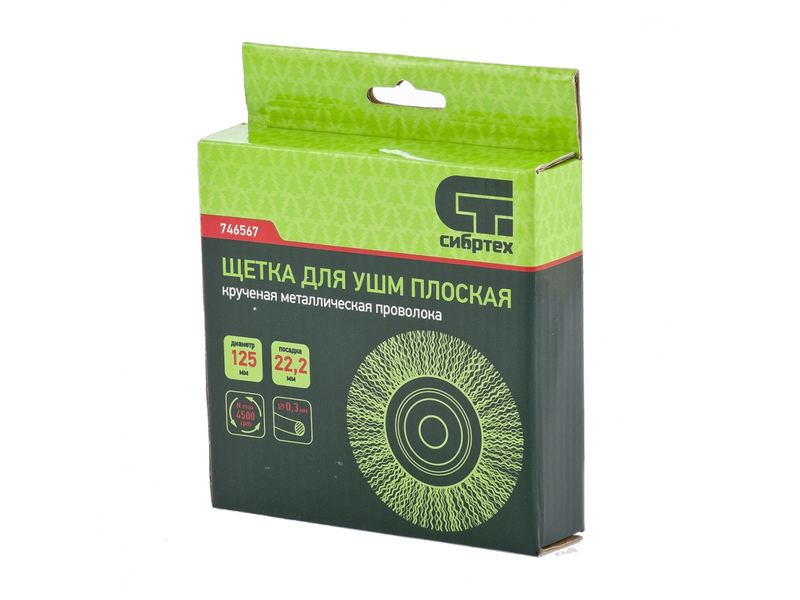 Плоская щетка для УШМ Сибртех 746567 диаметром 125 мм, с посадкой 22,2 мм, с щетиной из витой проволоки диаметром 0,3 мм, предназначена для щадящей очистки твердых поверхностей от загрязнений, ржавчины, остатков краски и других покрытий. Щетина из тонкой проволоки постепенно снимает тонкий слой материала, позволяя придать шероховатость или подчеркнуть структуру материала.,Насадка устанавливается на фланец углошлифовальной машины и подходит для продолжительной работы, не требующей частой смены оснасток. Рекомендуемая максимальная скорость вращения составляет 4500 об/мин. Для обеспечения безопасности пользователя следует использовать средства индивидуальной защиты. Щетка применяется в строительной, производственной сфере, а также в быту.