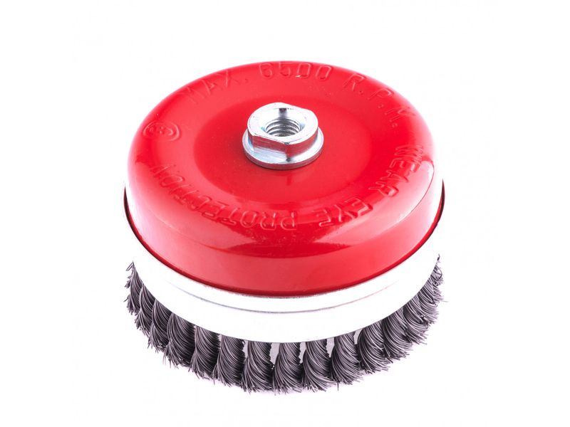 Щетка для УШМ «Чашка» Matrix Heavy Duty 74674 диаметром 125 мм, посадкой М14, с щетиной из крученой проволоки толщиной 0,5 мм, используется для грубой (черновой) обработки поверхностей. Устанавливается на УШМ, поддерживающую скорость вращения до 6500 об/мин. Усиленный корпус с дополнительным стягивающим кольцом отличается повышенной стойкостью к нагрузкам. Оснастка применяется для снятия толстого слоя ржавчины и лакокрасочных покрытий, зачистки сварных швов, удаления загрязнений.