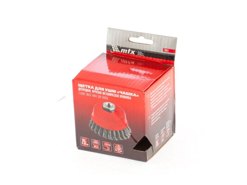 Двухрядная щетка Matrix «Чашка» 74681 диаметром 75 мм, с щетиной из крученой проволоки толщиной 0,5 мм, устанавливается на вал углошлифовальной машины с помощью гайки М14. Рекомендованная максимальная скорость вращения — до 12500 об/мин. Оснастка оптимальна для грубой (черновой) обработки: снятия старого слоя лакокрасочного покрытия и ржавчины, удаления загрязнений, зачистки сварных швов. Эффективно справляется с зачисткой больших поверхностей, подходит для выполнения работ повышенной сложности.