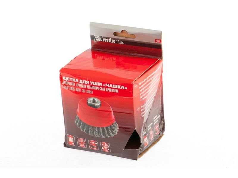 Двухрядная щетка Matrix «Чашка» 74687 диаметром 100 мм, с щетиной из крученой проволоки толщиной 0,8 мм, устанавливается на вал углошлифовальной машины с помощью гайки М14. Рекомендованная максимальная скорость вращения — до 8500 об/мин. Оснастка оптимальна для грубой (черновой) обработки: снятия старого слоя лакокрасочного покрытия и ржавчины, удаления загрязнений, зачистки сварных швов. Эффективно справляется с зачисткой больших поверхностей, подходит для выполнения работ повышенной сложности.