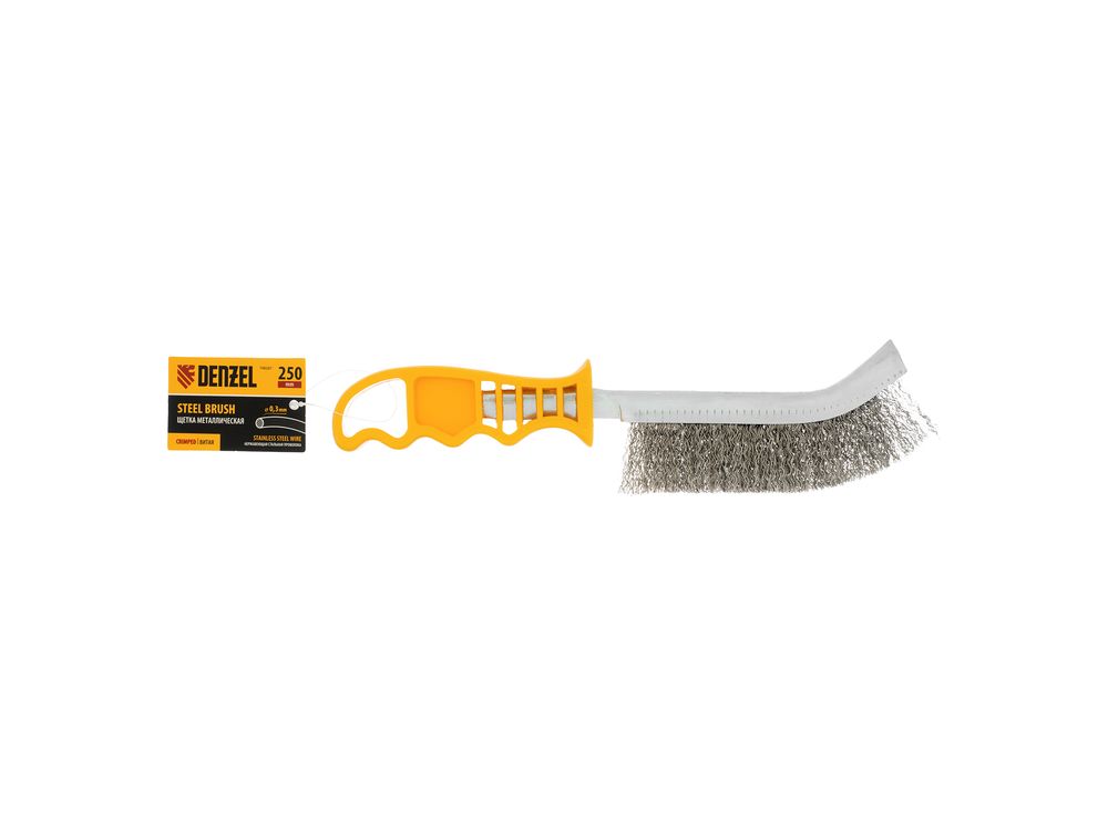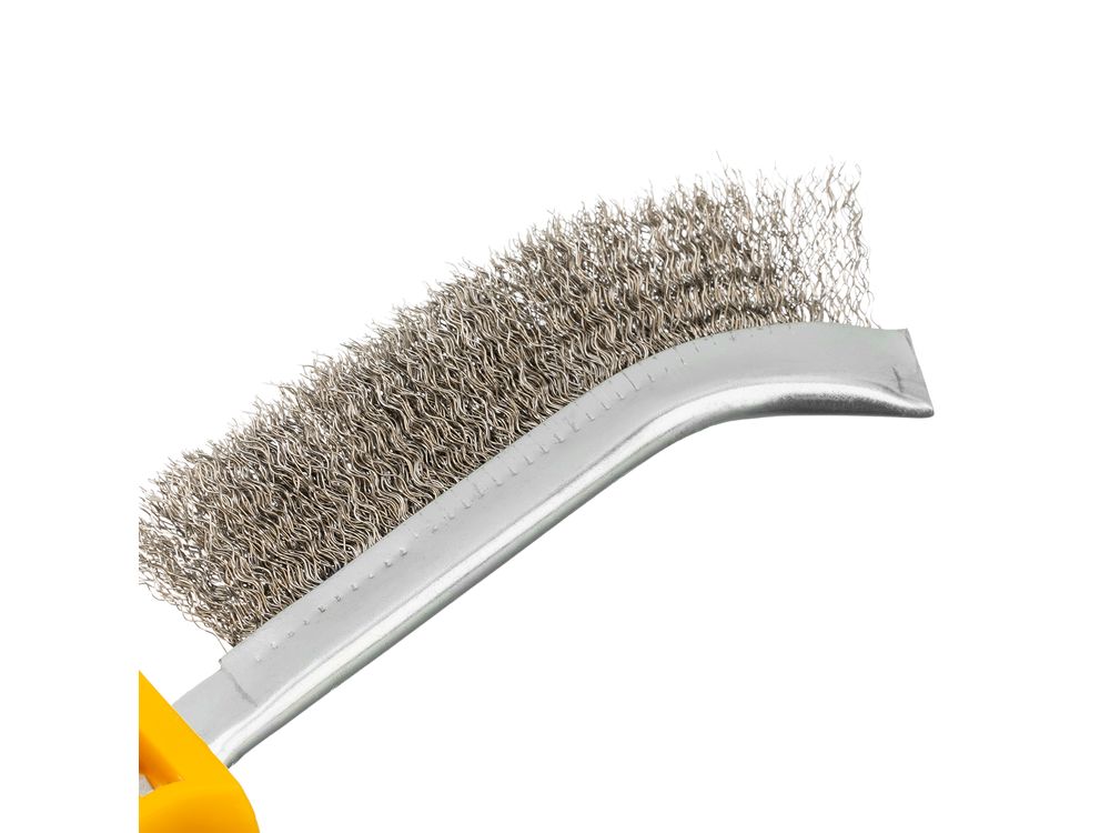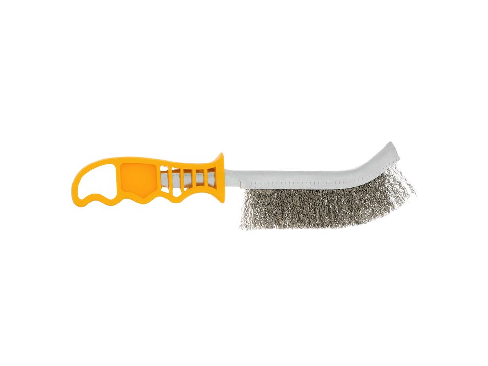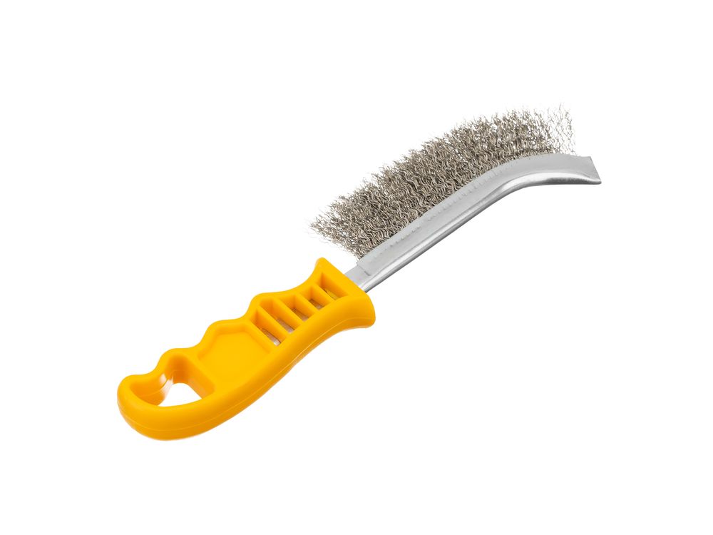 Металлическая зачистная щетка Denzel 748287 с пластмассовой рукояткой и щетиной из нержавеющей проволоки, используется для очищения металлических, деревянных и других поверхностей от ржавчины, загрязнений, остатков лакокрасочных покрытий. Щетина из нержавейки с высокой абразивной способностью обеспечивает эффективность щетки. Благодаря изогнутому корпусу щетка удобна для обработки поверхностей со сложным рельефом. Инструмент пригодится во время строительства, кузовного ремонта, а также на производстве и в быту.