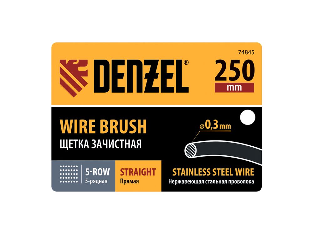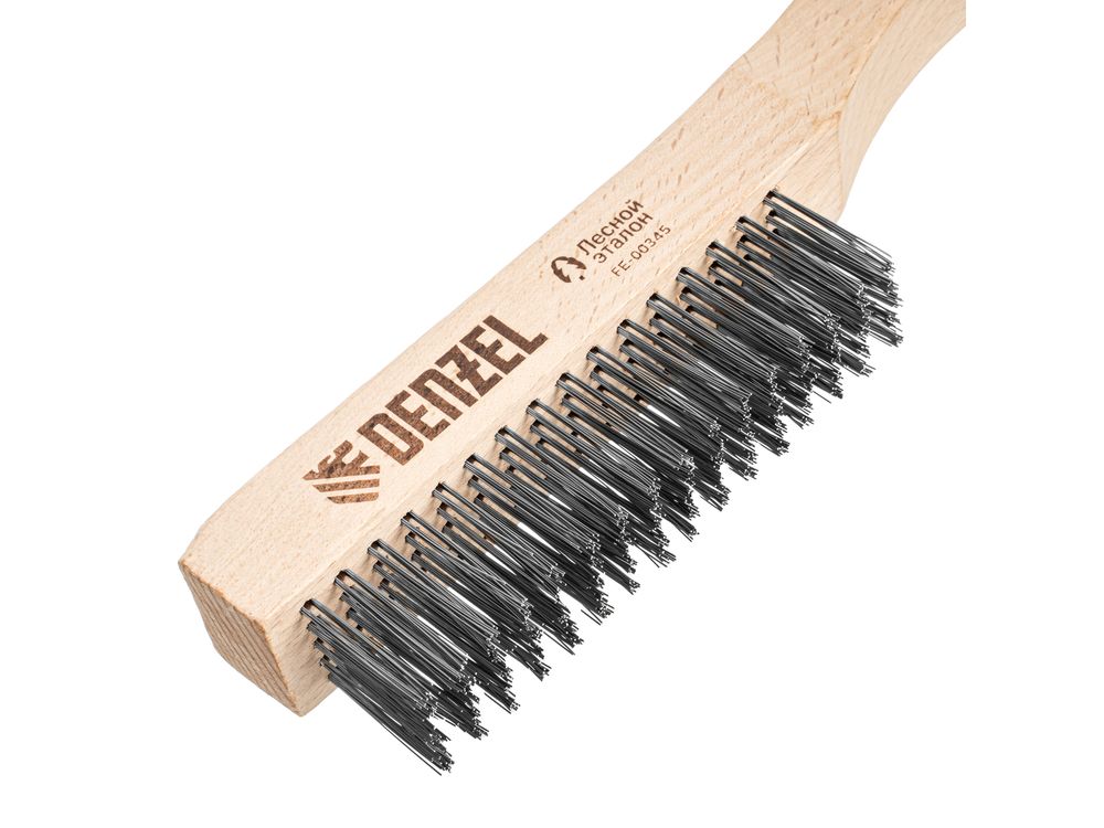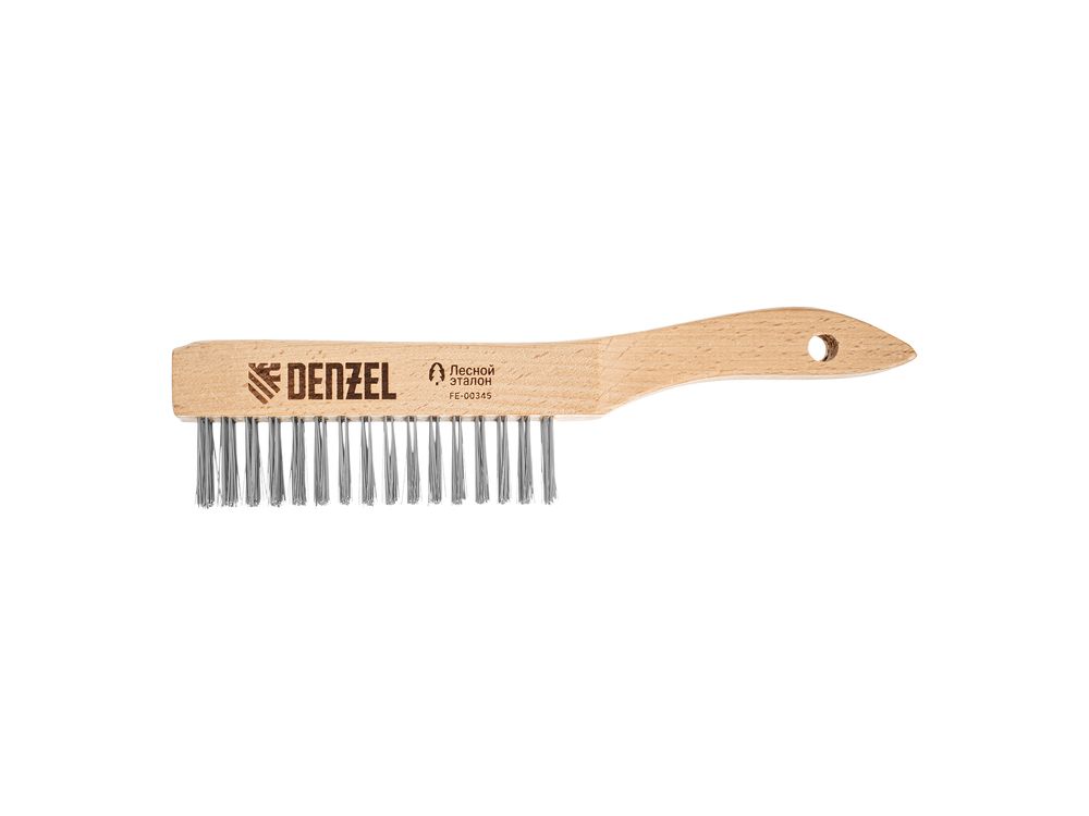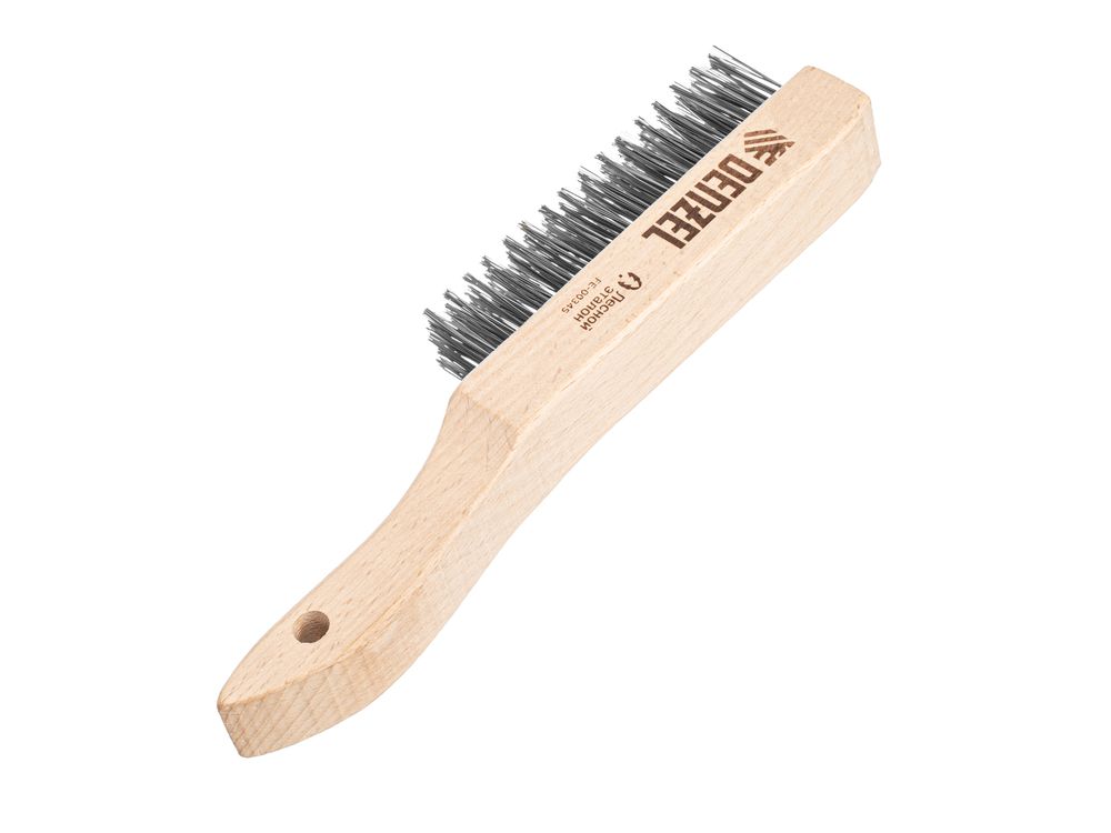 Зачистная 5-рядная щетка Denzel 74845 с прямой проволокой из нержавеющей стали и деревянной рукояткой — ручной инструмент для обработки деревянных, металлических и других поверхностей. Позволяет удалять загрязнения, ржавчину, остатки отделочных покрытий и т.д. Стальная щетина толщиной 0,3 мм с высокой абразивной способностью, расположенная в 5 рядов, обеспечивает эффективное выполнение работ.