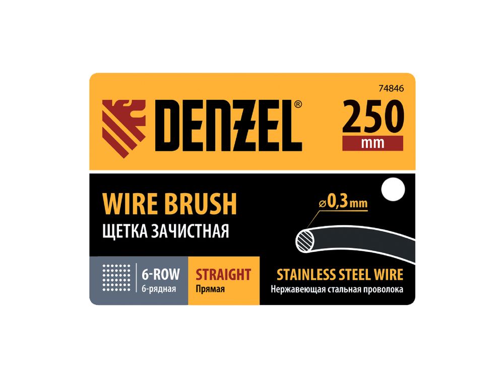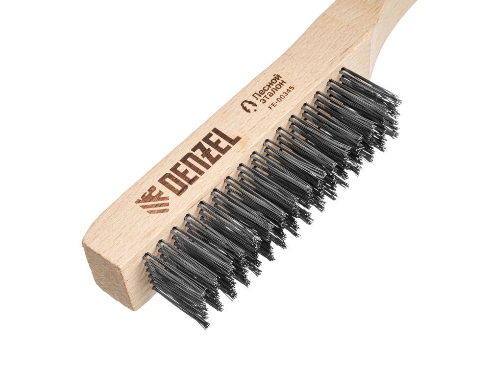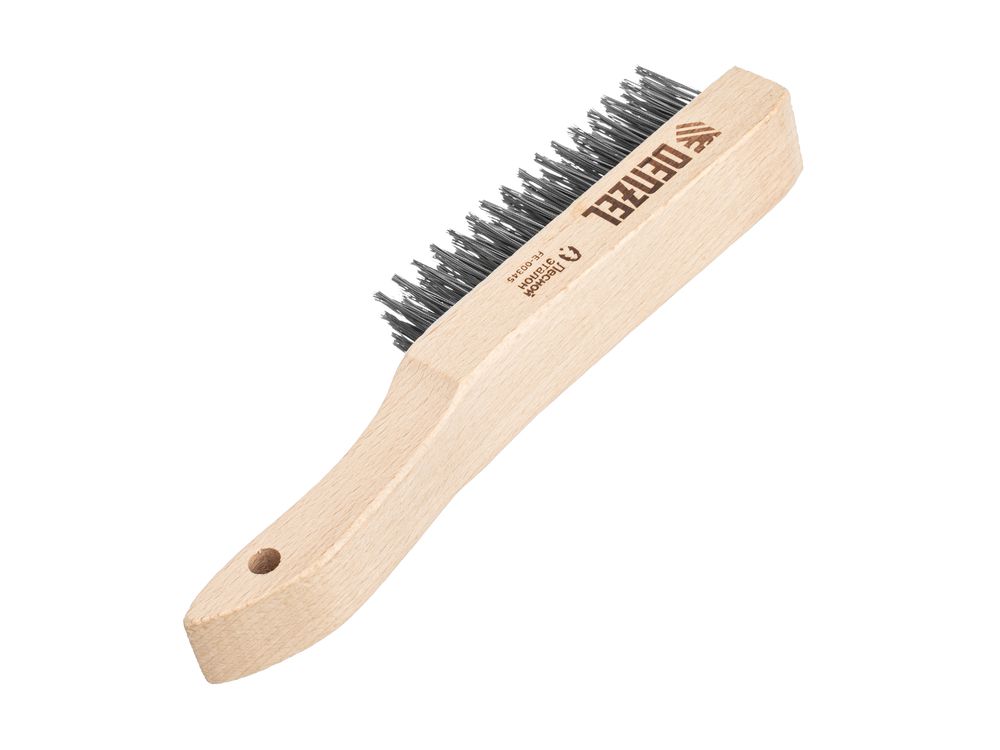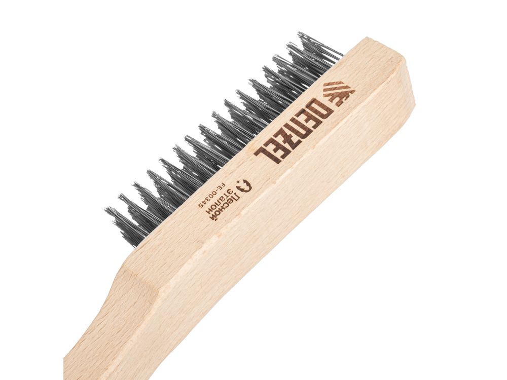 Зачистная 6-рядная щетка Denzel 74846 с прямой проволокой из нержавеющей стали и деревянной рукояткой — ручной инструмент для обработки деревянных, металлических и других поверхностей. Позволяет удалять загрязнения, ржавчину, остатки отделочных покрытий и т.д. Стальная щетина толщиной 0,3 мм с высокой абразивной способностью, расположенная в 6 рядов, обеспечивает эффективное выполнение работ.