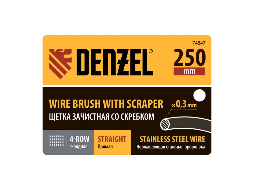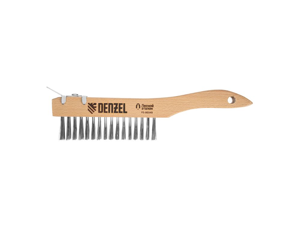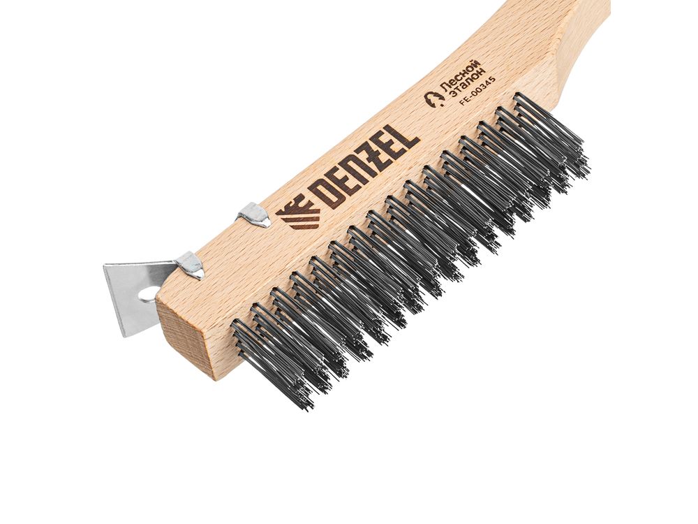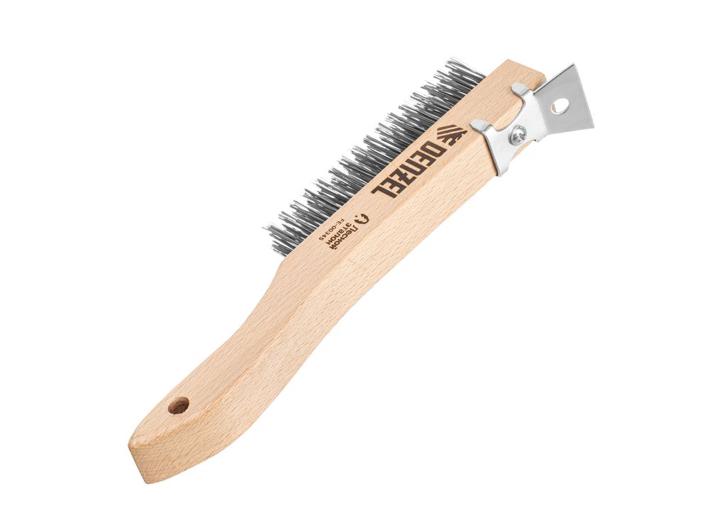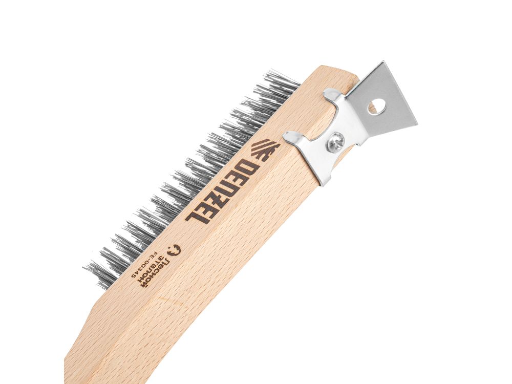 Зачистная 4-рядная щетка Denzel 74847 с проволокой из нержавеющей стали и деревянной рукояткой — ручной инструмент для обработки деревянных, металлических и других поверхностей. Позволяет удалять загрязнения, ржавчину, остатки отделочных покрытий и т.д. Стальная щетина толщиной 0,3 мм, расположенная в 4 ряда, отличается высокой абразивной способностью. Скребок облегчает удаление загрязнений, ускоряет и упрощает работу.