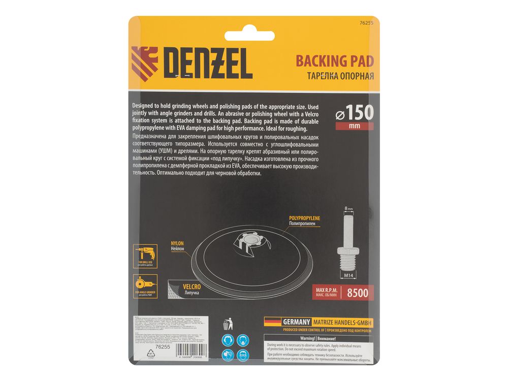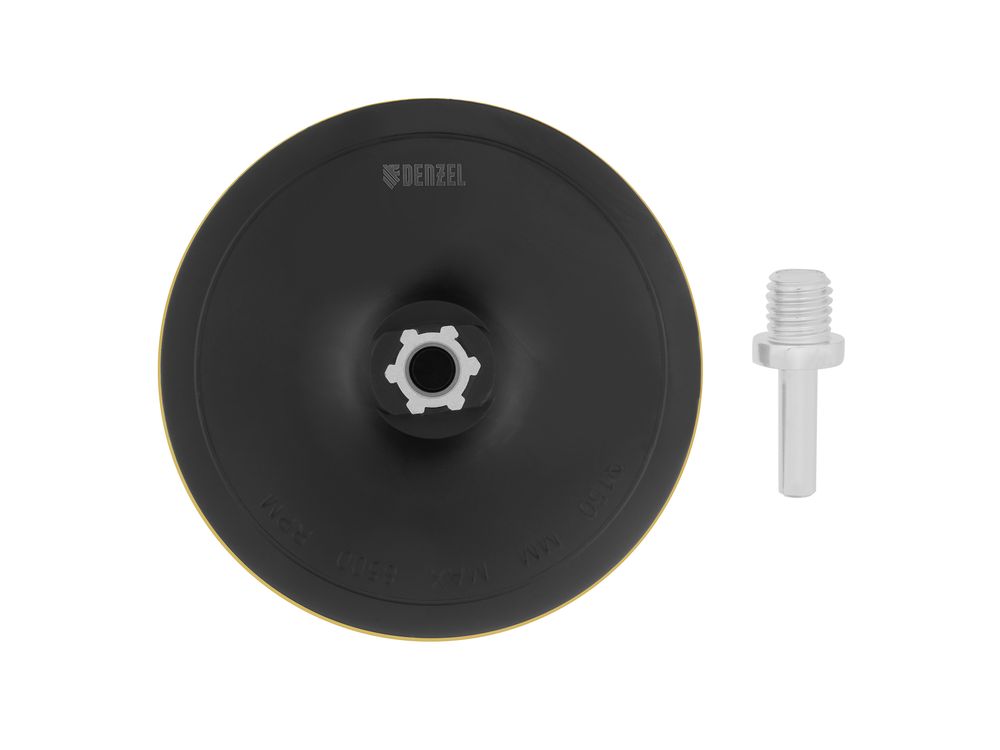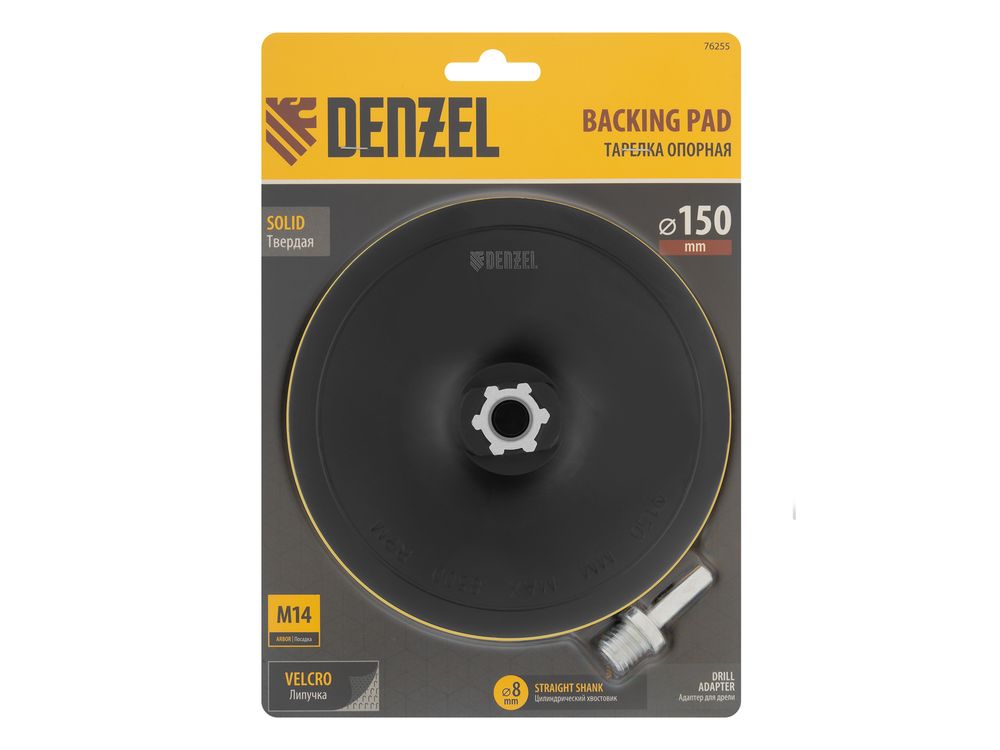 Тарелка опорная Denzel 76255 диаметром 150 мм, с липучкой и адаптером с М14 на d8, твердая, устанавливается на дрель или углошлифовальную машину (УШМ). Используется для крепления абразивных или полировальных кругов на ворсовой основе, позволяет подготовить поверхность для дальнейшей обработки или придать ей финишную гладкость.