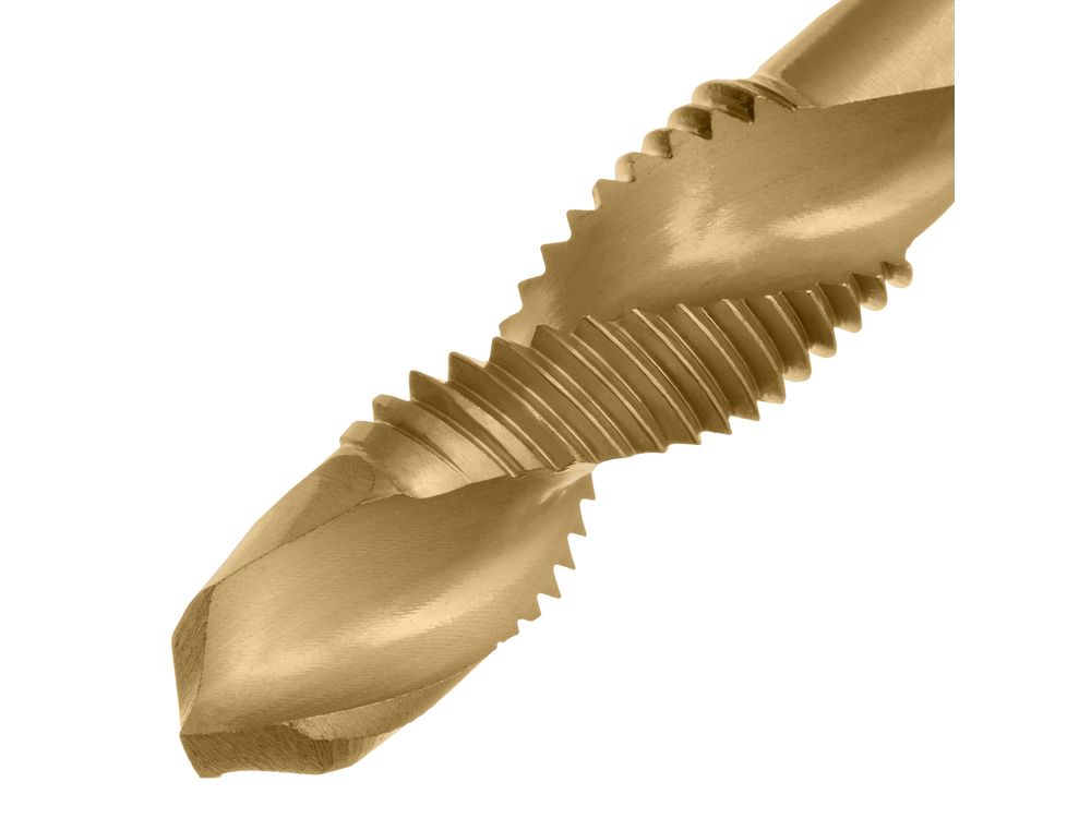 Долговечность — нитридтитановое покрытие защищает от повреждений и уменьшает трение, что увеличивает устойчивость сверла-метчика к износу.