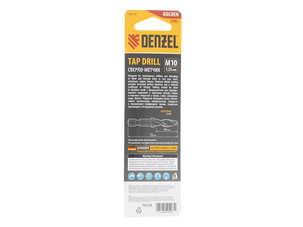 Сверло-метчик Denzel 76724 из стали P6M5 предназначено для получения глухих и сквозных отверстий в металлических заготовках с одновременным нарезанием правой резьбы M10 с шагом 1,25 мм. Позволяет существенно сэкономить время работы, объединив две операции в одну. Угол заточки 135° оптимален для работы с чугуном, сталью, алюминием, медью, бронзой. Ресурс оснастки увеличен в 10 раз по сравнению с аналогичными моделями из углеродистой стали.