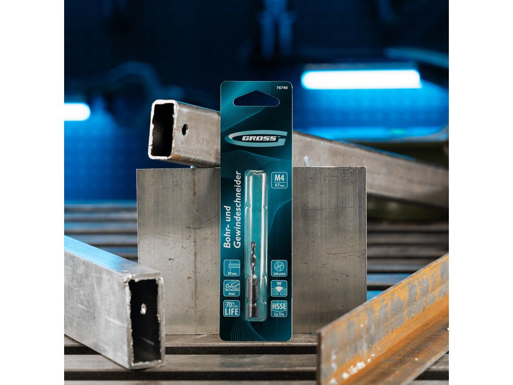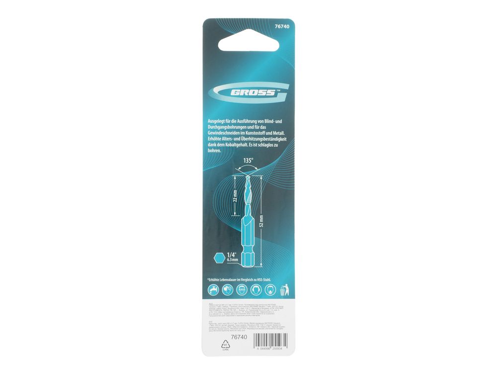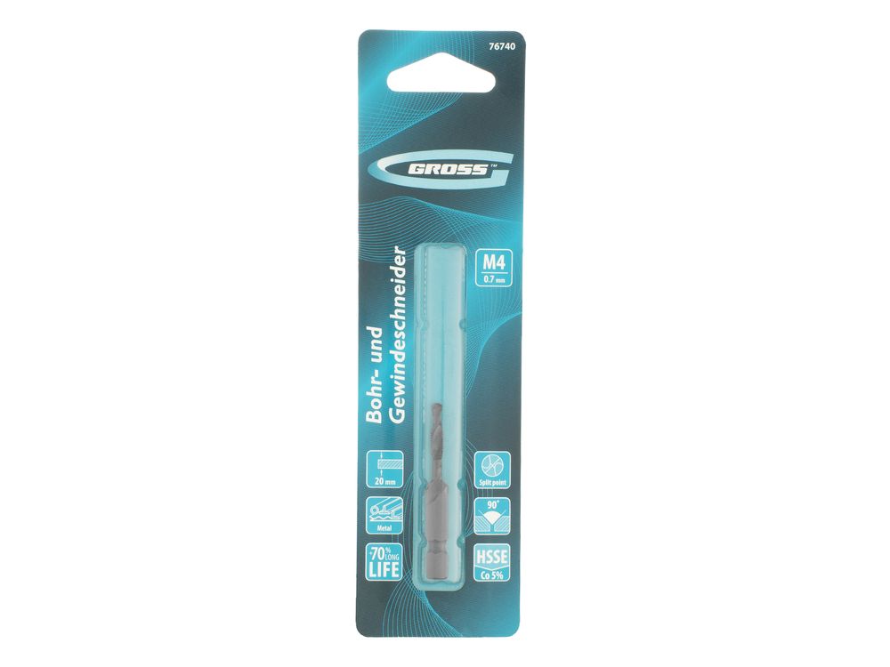 Сверло-метчик Gross 76740 из стали с 5%-м содержанием кобальта предназначено для получения глухих и сквозных отверстий в металлических заготовках с одновременным нарезанием правой резьбы M4 с шагом 0,7 мм. Позволяет существенно сэкономить время работы, объединив две операции в одну. Угол заточки 135° оптимален для работы с чугуном, сталью, алюминием, медью, бронзой.