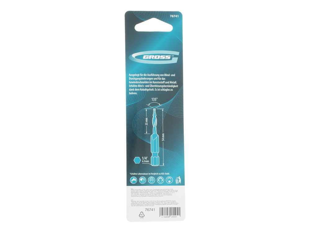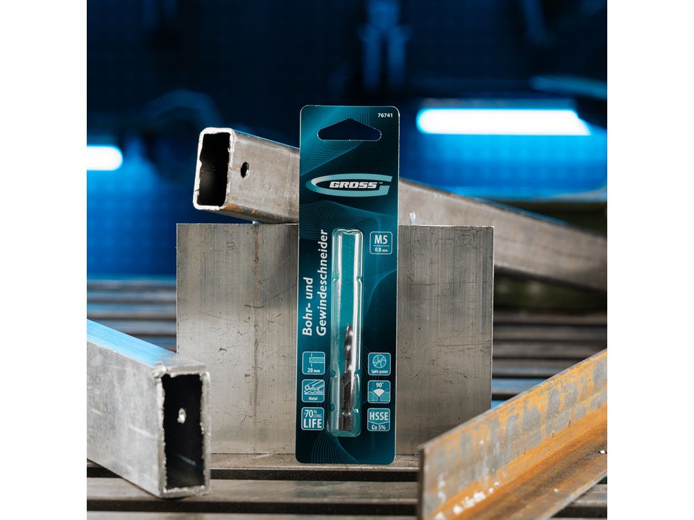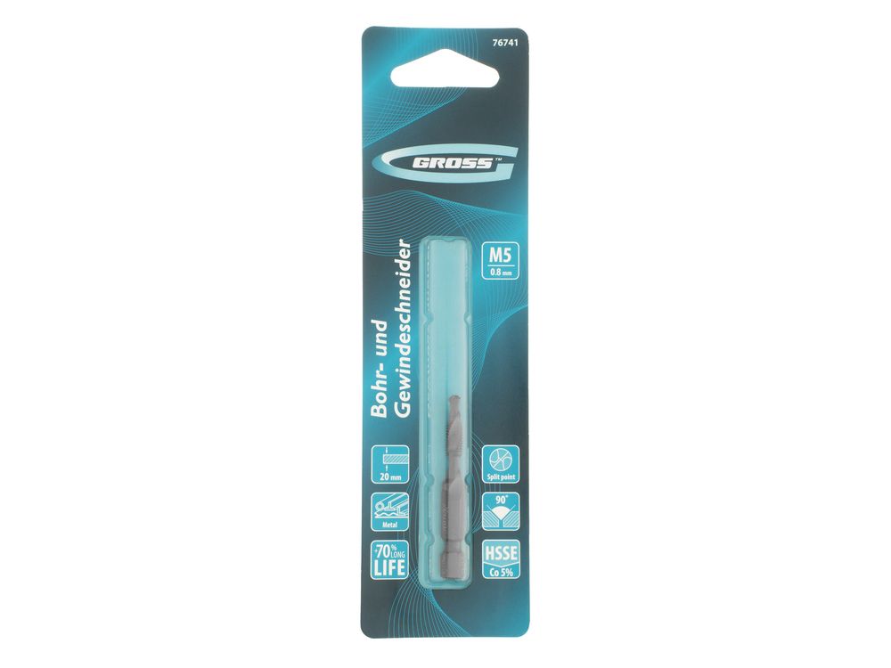 Сверло-метчик Gross 76741 из стали с 5%-м содержанием кобальта предназначено для получения глухих и сквозных отверстий в металлических заготовках с одновременным нарезанием правой резьбы M5 с шагом 0,8 мм. Позволяет существенно сэкономить время работы, объединив две операции в одну. Угол заточки 135° оптимален для работы с чугуном, сталью, алюминием, медью, бронзой.