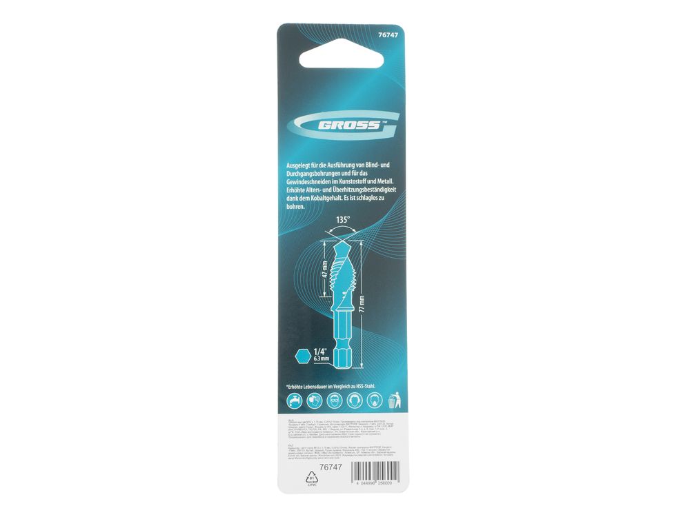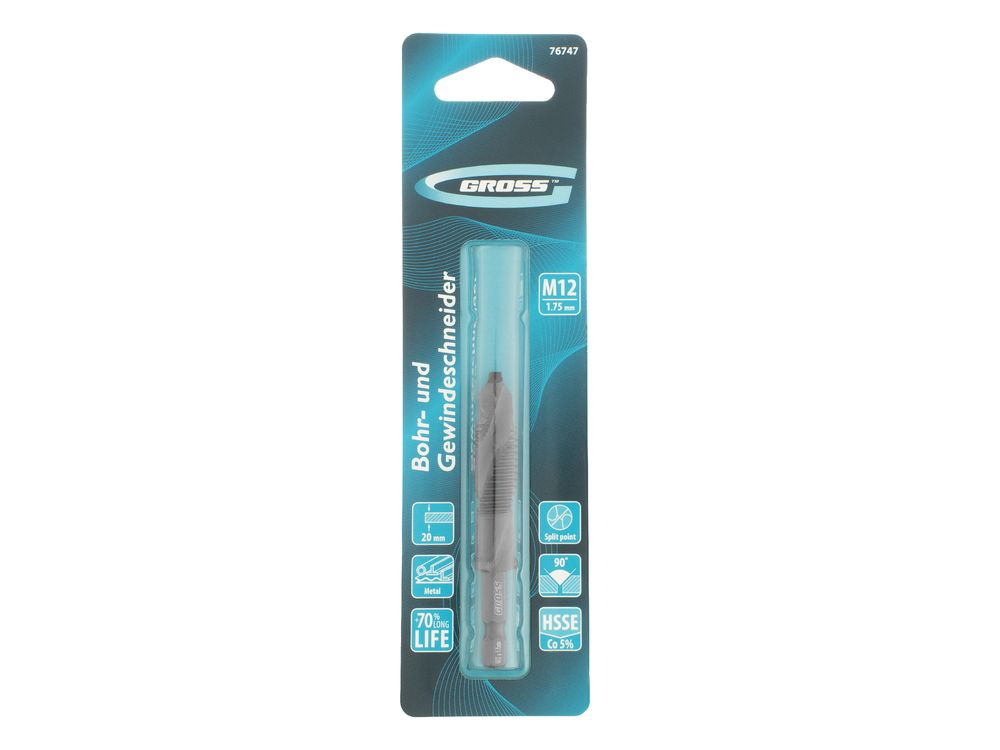 Сверло-метчик Gross 76747 из стали с 5%-м содержанием кобальта предназначено для получения глухих и сквозных отверстий в металлических заготовках с одновременным нарезанием правой резьбы M12 с шагом 1,75 мм. Позволяет существенно сэкономить время работы, объединив две операции в одну. Угол заточки 135° оптимален для работы с чугуном, сталью, алюминием, медью, бронзой.