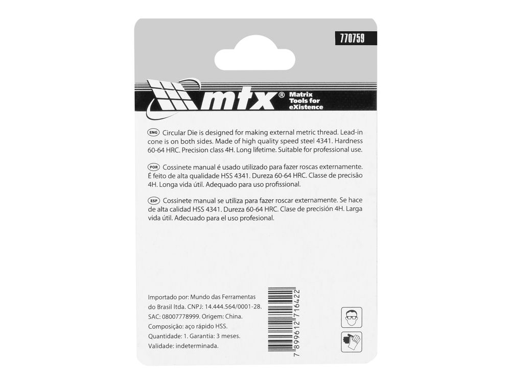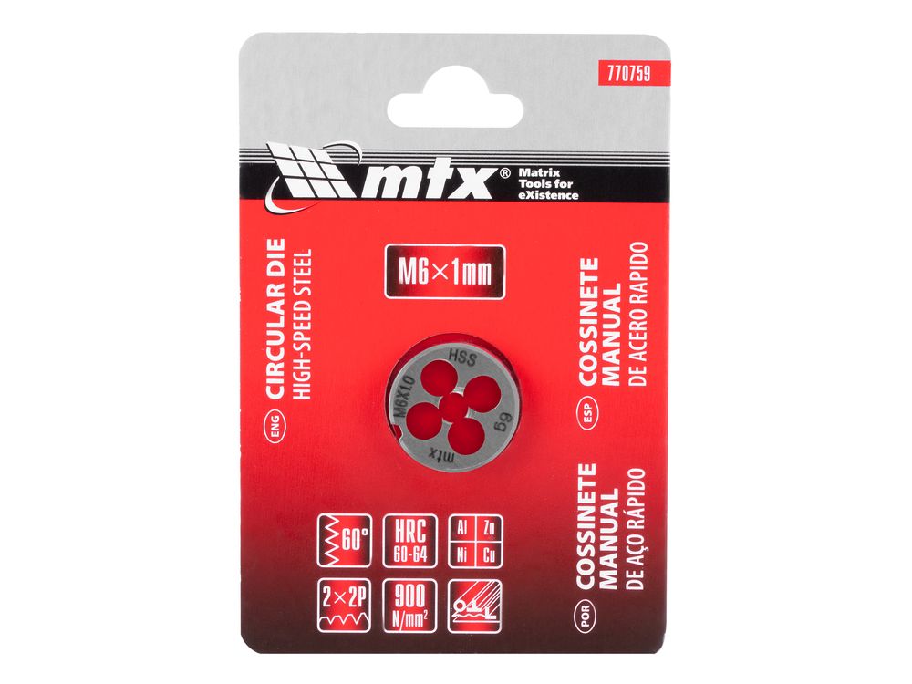 Плашка MTX 770759, HSS, М6 х 1,0 мм, относится к категории резьбонарезного инструмента, предназначенного для восстановления старой или создания новой внешней метрической резьбы на металлических деталях. Благодаря простой конструкции для эксплуатации плашки не требуется особых навыков, что позволяет осуществлять слесарные и монтажные работы в домашних условиях. А за счет цельного корпуса обеспечивается жесткое сцепление с деталью, поэтому резьба получается высококачественной.