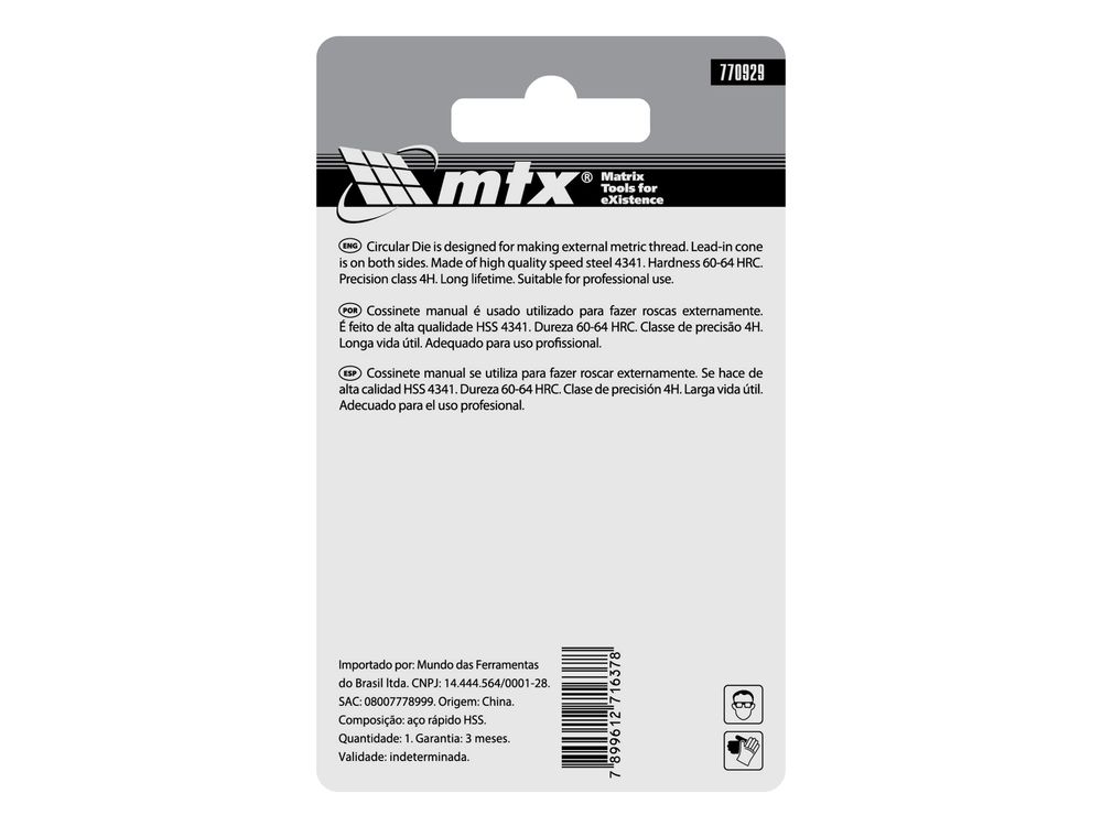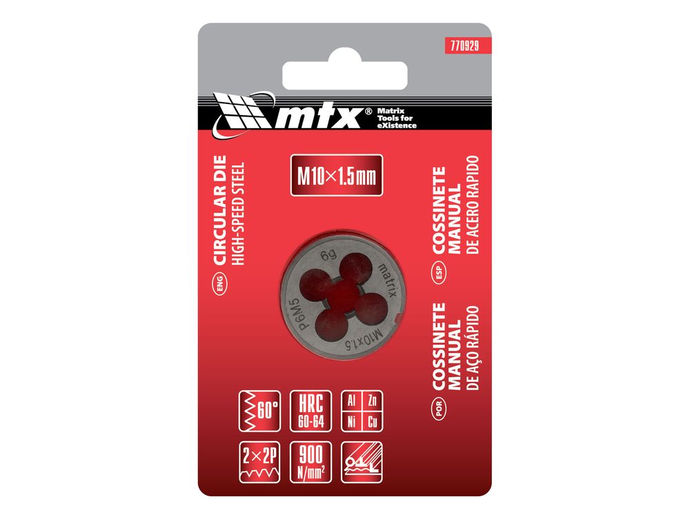 Плашка MTX 770929, HSS, М10 х 1,5 мм, относится к категории резьбонарезного инструмента, предназначенного для восстановления старой или создания новой внешней метрической резьбы на металлических деталях. Благодаря простой конструкции для эксплуатации плашки не требуется особых навыков, что позволяет осуществлять слесарные и монтажные работы в домашних условиях. А за счет цельного корпуса обеспечивается жесткое сцепление с деталью, поэтому резьба получается высококачественной.