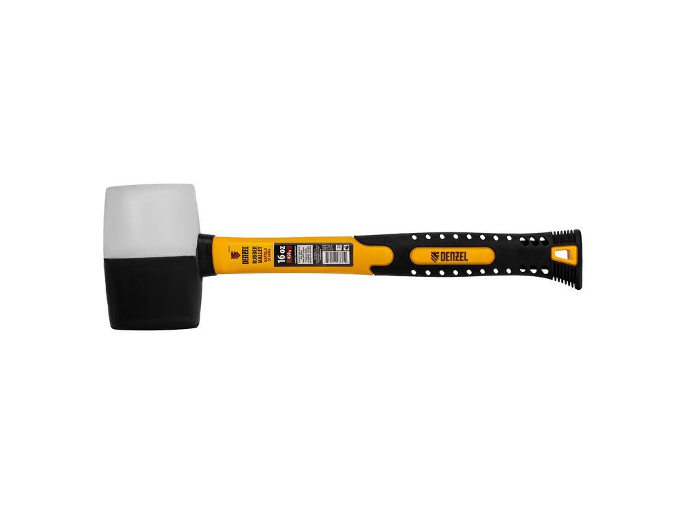 Резиновая киянка Denzel из черно-белой резины с фибергласовой рукояткой, 16 oz(450 г), применяется при проведении монтажных, сборочных и кузовных работ, укладке плитки. Резиновый боек обладает высокими амортизирующими свойствами. Часть бойка из белой резины не оставляет следов, поэтому подходит для работы со светлыми материалами. Рукоятка обладает высоким рабочим ресурсом, т.к. выполнена из фибергласа с обрезиненным покрытием который обеспечивает надежный хват без проскальзывания. Киянка имеет высокий показатель прочности, устойчива к воздействию внешней агрессивной среды и хорошо поглащает вибрацию, поэтому подходит для профессионального применения.