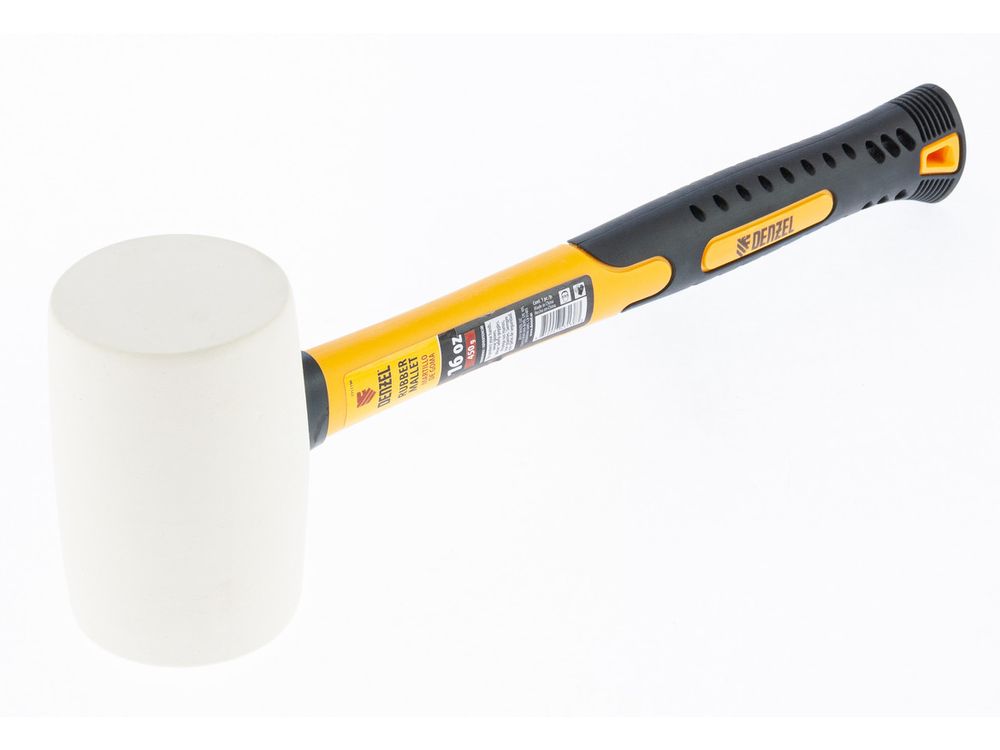 Резиновая киянка Denzel из белой резины с фибергласовой рукояткой,16 oz(450 г), применяется при проведении монтажных, сборочных и кузовных работ, укладке плитки. Резиновый боек обладает высокими амортизирующими свойствами.Боек изготовлен из белой резины и не оставляет следов, поэтому подходит для работы со светлыми материалами. Рукоятка обладает высоким рабочим ресурсом, т.к. выполнена из фибергласа с обрезиненным покрытием который обеспечивает надежный хват без проскальзывания. Киянка имеет высокий показатель прочности, устойчива к воздействию внешней агрессивной среды и хорошо поглащает вибрацию, поэтому подходит для профессионального применения.