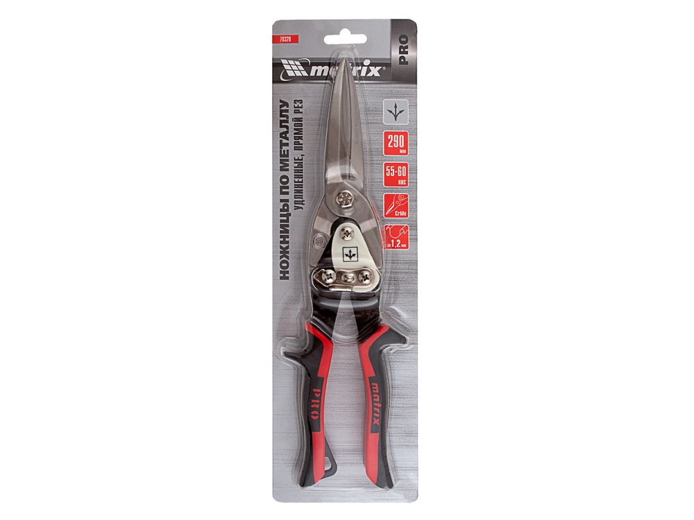 Удлиненные ножницы по металлу Matrix PRO 78328 длиной 290 мм, из стали CrMo, с двухкомпонентными обрезиненными рукоятками, предназначены для прямого реза листовых и профильных металлических заготовок, в том числе стали толщиной до 1,2 мм и «нержавейки» толщиной до 0,7 мм. Двойной рычажный механизм позволяет передавать значительное усилие, облегчая резку материала большой толщины. Для удобства работы на корпусе имеется маркировка с указанием направления резания. Ножницы будут полезны в профессиональной и домашней мастерской.