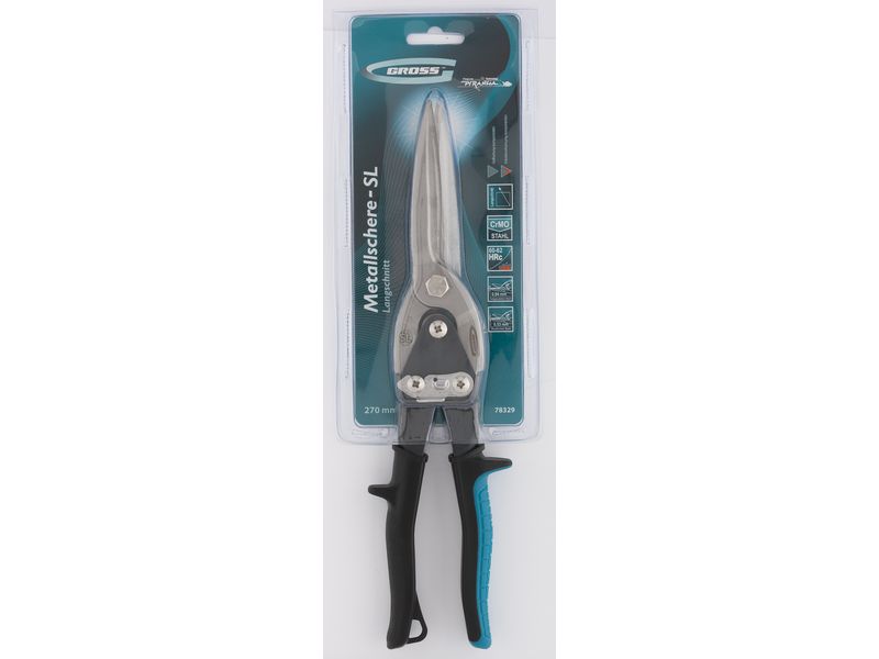 Ножницы по металлу Gross PIRANHA 78329 длиной 270 мм, из стали CrMo, с двухкомпонентными рукоятками, используются для прямого проходного реза плоских заготовок. Обеспечивают точный рез, справляются с холоднокатаной сталью толщиной до 0,94 мм и «нержавейкой» толщиной до 0,53 мм. Двойной рычажный механизм снижает нагрузку на руку мастера при резке твердых материалов. Ножницы предназначены для профессиональных слесарных работ, пригодятся также и в быту.