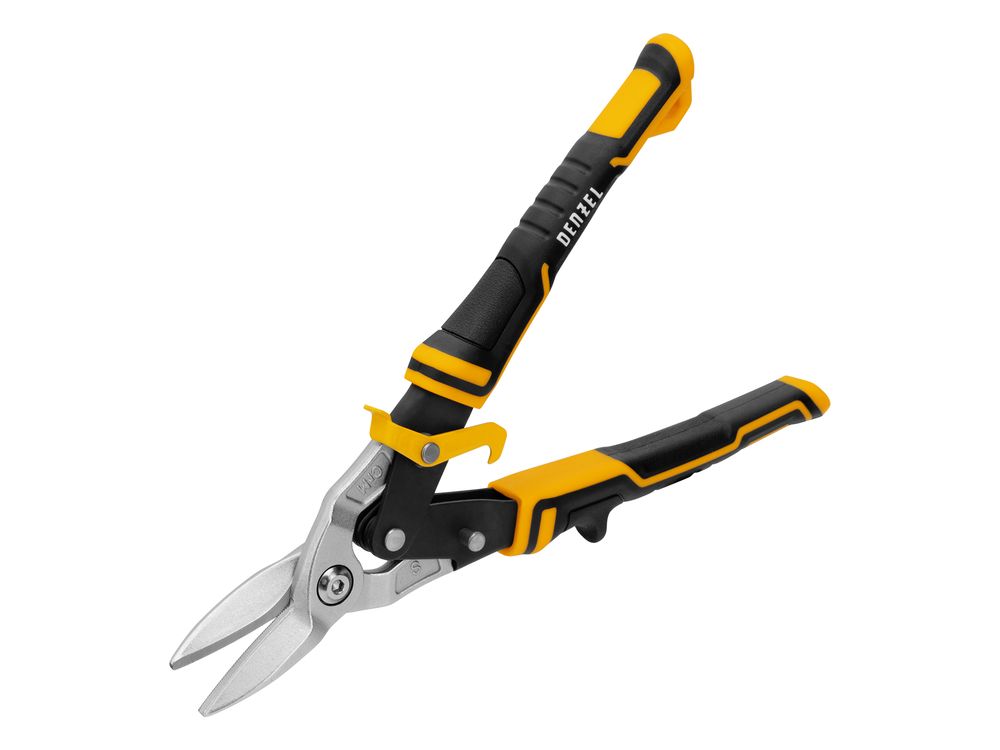 Ножницы по металлу Denzel 78370 общей длиной 270 мм, из стали-CrMo, с трехкомпонентными рукоятками, предназначены для прямого реза листовых металлических заготовок и металлопрофиля толщиной до 1,2 мм. Инструмент с усиленной конструкцией осевого шарнира рассчитан на профессиональное использование. Ножницы используются для проведения строительных, кровельных и слесарных работ.