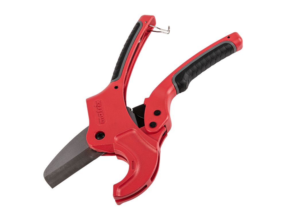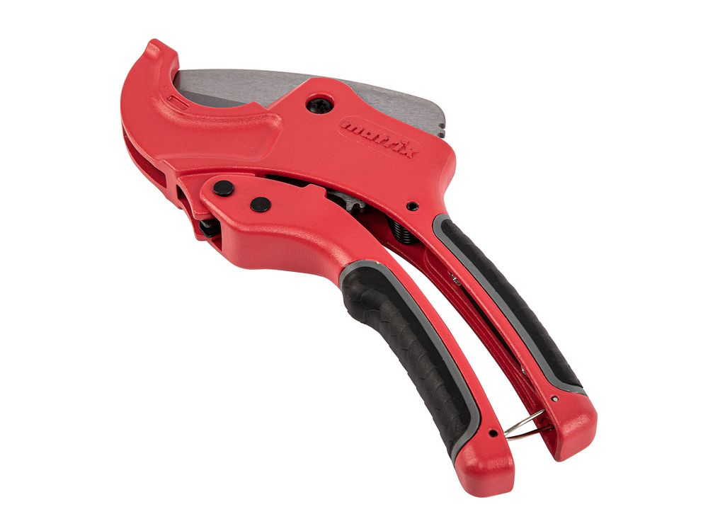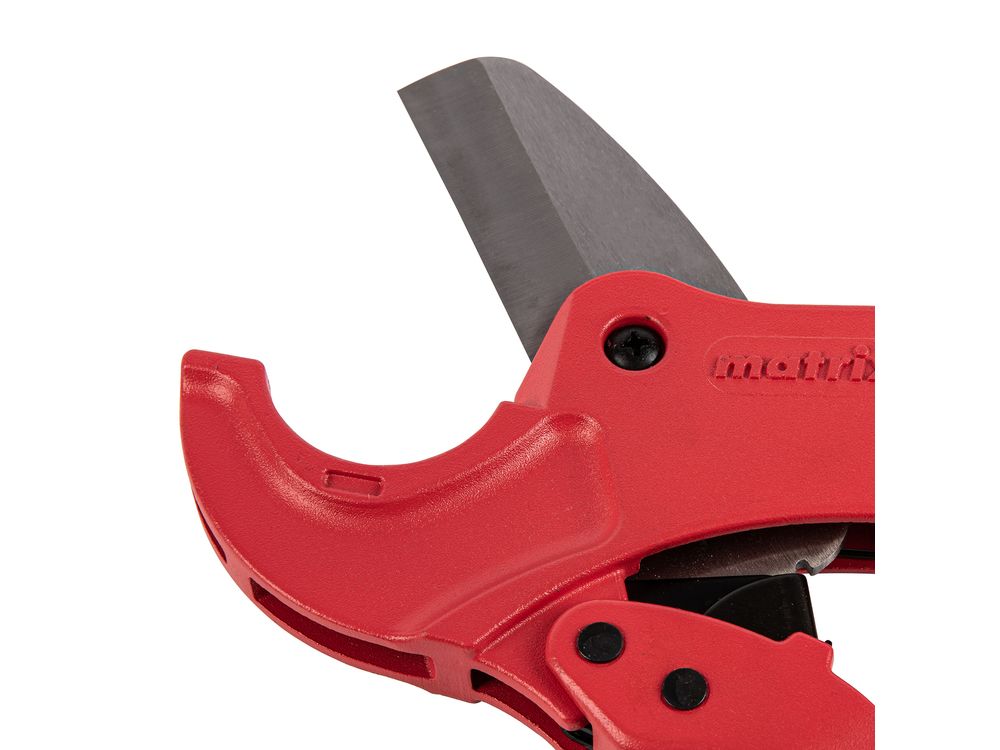 Ножницы для резки изделий из ПВХ Matrix 78411 с лезвием из нержавеющей стали и функцией автоматического раскрытия применяются для работы с пластиковыми трубами диаметром до 42 мм, а также для разрезания профилей, плинтусов, галтелей, реек, планок, резиновых шлангов и других предметов. Прямой нож инструмента позволяет резать плоские заготовки. Ножницы пригодятся для выполнения сантехнических и отделочных работ., , Преимущества, Прочность и долговечность — режущее полотно изготовлено из нержавеющей стали 3CR13., Защита от коррозии — на корпус нанесено порошковое покрытие., Высокая эффективность — механизм автоматического раскрытия позволяет выполнять работу быстрее, не прикладывая больших усилий., Комфортная работа без ощущения усталости — храповой механизм минимизирует прикладываемые усилия., Безопасное хранение и транспортировка — рукоятки можно заблокировать в сведенном положении., , Для корректной работы инструмента, чтобы предотвратить перекос лезвия относительно ПВХ-трубы, рекомендуется, чтобы отрезаемая часть была больше или равна внешнему диаметру ПВХ-трубы. В противном случае может возникнуть перекос лезвия, что также может привести к поломке лезвия/инструмента.