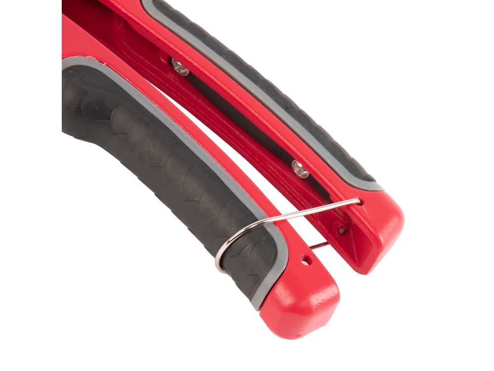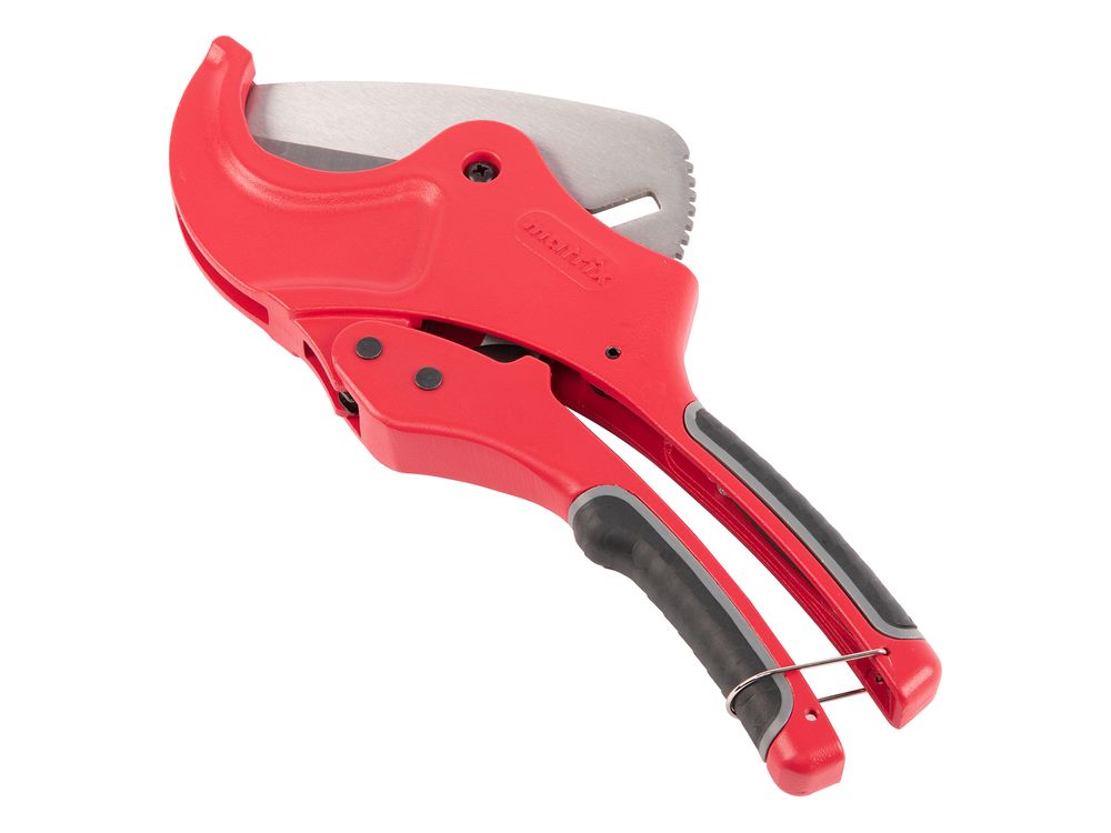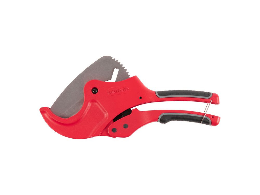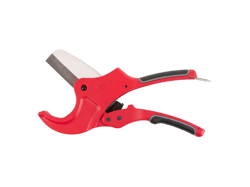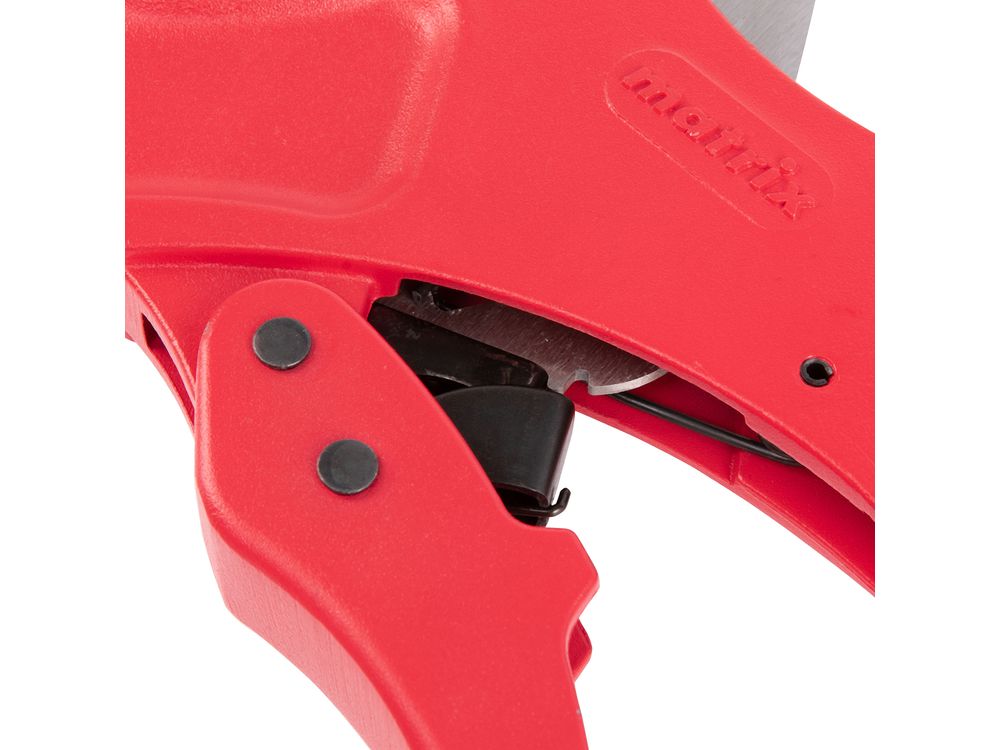 Ножницы для резки изделий из ПВХ Matrix 78419 с лезвием из нержавеющей стали и функцией автоматического раскрытия применяются для работы с пластиковыми трубами диаметром до 63 мм, а также для разрезания профилей, плинтусов, галтелей, реек, планок, резиновых шлангов и других предметов. Прямой нож инструмента позволяет резать плоские заготовки. Ножницы пригодятся для выполнения сантехнических и отделочных работ.