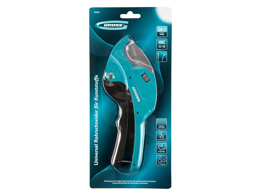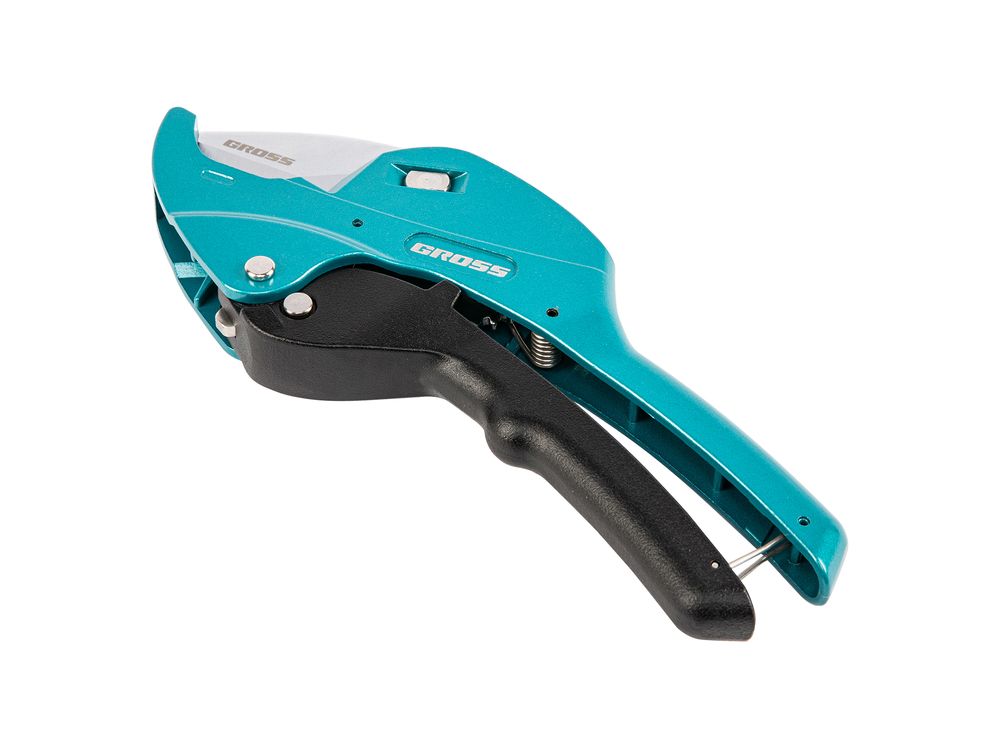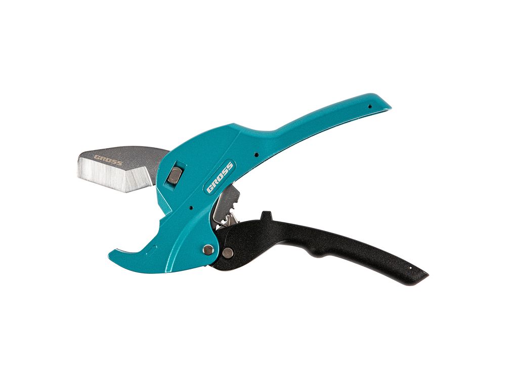 Универсальные ножницы для резки изделий из ПВХ Gross 78425 применяются для работы с пластиковыми трубами диаметром до 32 мм, а также для разрезания профилей, плинтусов, галтелей, реек, планок, резиновых шлангов и других предметов. Прямой нож инструмента позволяет резать плоские заготовки. Ножницы пригодятся для выполнения сантехнических и отделочных работ.