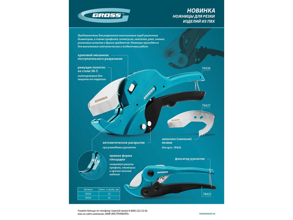 Лезвие Gross 78427 — сменный режущий элемент для ножниц по изделиям из ПВХ диаметром 42 мм, совместимый с арт. 78426. Предназначено для резки пластиковых труб, профилей, галтелей, плинтусов, реек, планок, резиновых шлангов и других предметов. Позволяет быстро восстановить работоспособность инструмента и избежать нежелательных перерывов в ходе сантехнических и отделочных работ.
