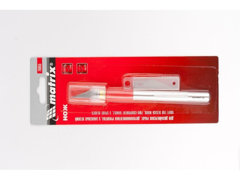 Нож Matrix 78855 с двухкомпонентной рукояткой и 5 запасными лезвиями, используется для дизайнерских работ: фигурного вырезания, изготовления мелких декоративных элементов. Он эффективно справляется с резкой бумаги и обоев, позволяя получить художественный результат.