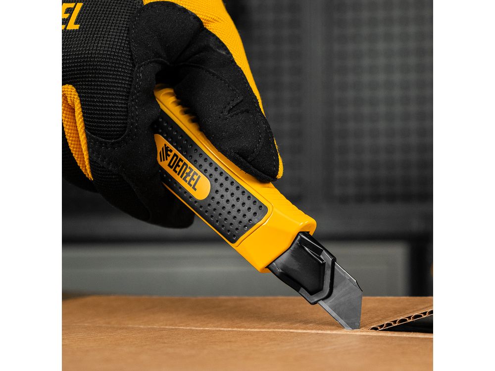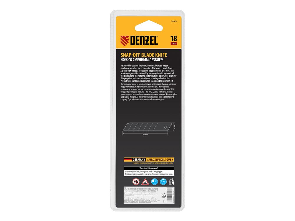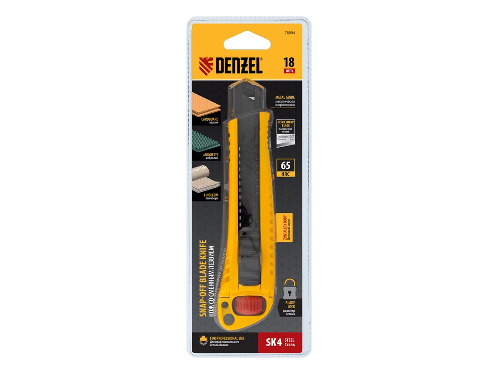 Нож Denzel 78904 выполнен в корпусе из цинкового сплава с вставкой из термопластичной резины TPR, оснащен сменным лезвием шириной 18 мм, изготовленным из стали SK4 по технологии UltraSharp, и торцевым зажимом. Сверхострое выдвижное лезвие легко режет линолеум, ковролин, бумагу, обои, картон и другие листовые материалы. Нож будет полезен для проведения профессиональных ремонтных и отделочных работ, пригодится также в домашнем хозяйстве.