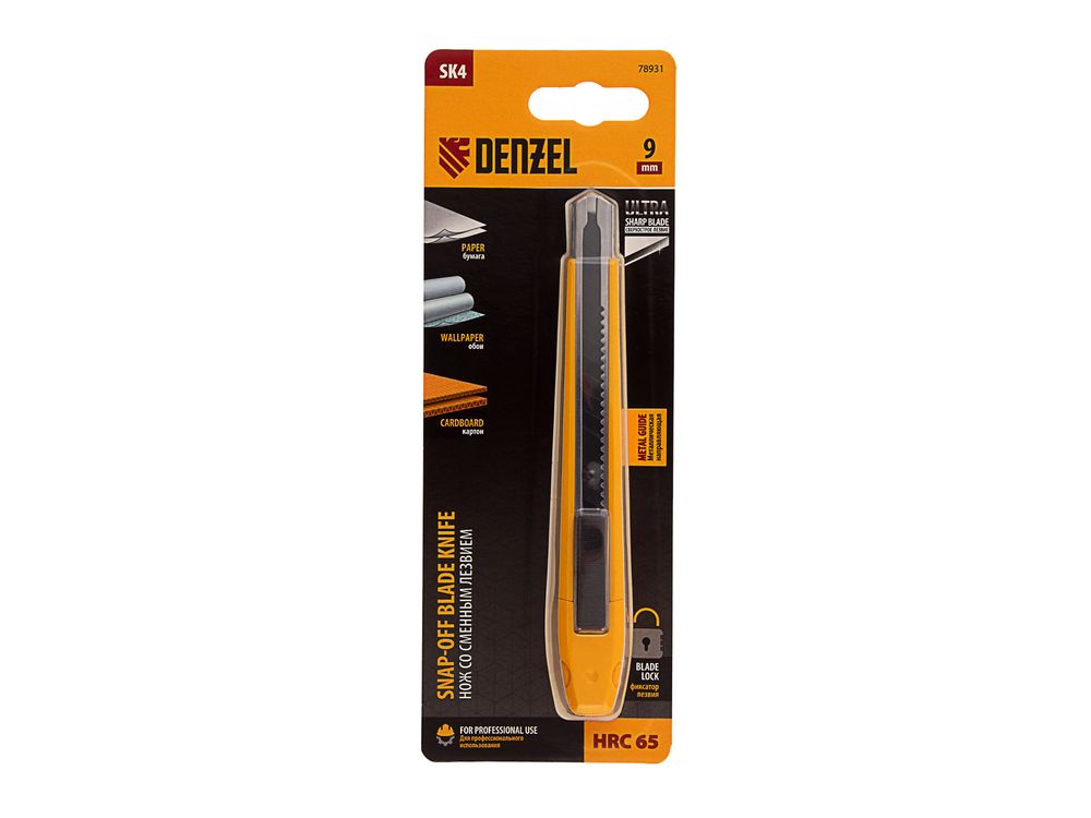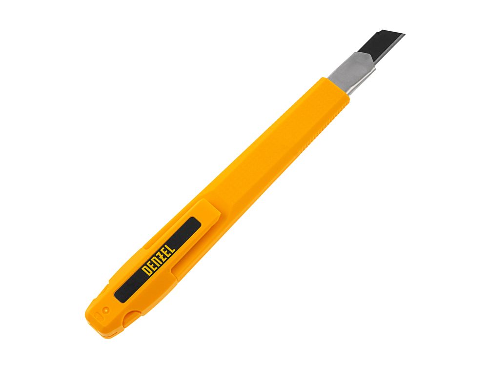 Нож Denzel 78931 со сменным лезвием шириной 9 мм, изготовленным из стали SK4, оснащен нажимным фиксатором, металлической направляющей и клипсой-держателем. Сверхострое выдвижное лезвие легко режет бумагу, обои, картон и другие листовые материалы. Нож рекомендован для профессионального применения, пригодится также в домашнем хозяйстве.