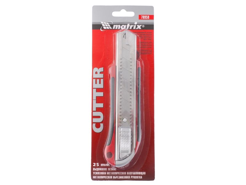 Нож Matrix 78959 с выдвижным лезвием шириной 25 мм, усиленной металлической направляющей и металлической обрезиненной ручкой служит для резания бумаги, картона, линолеума, обоев и других материалов. Благодаря усиленной направляющей нож не сломается даже при значительных нагрузках. Предусмотрена возможность ручной замены износившегося лезвия. Инструмент используется для проведения строительных работ, также полезен в быту.