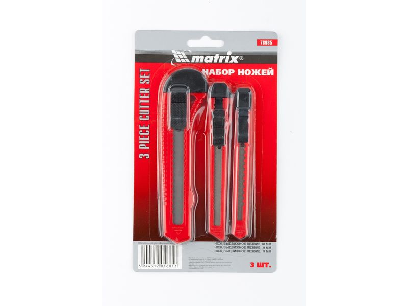 Набор Matrix 78985 состоит из 3 ножей с выдвижными лезвиями шириной 9-9-18 мм. Ими режут материалы, работа с которыми не требует особых усилий — картон, бумагу, обои, линолеум. Лезвия выдвигаются на необходимую длину в зависимости от толщины материала. Набор рекомендован для бытового использования.