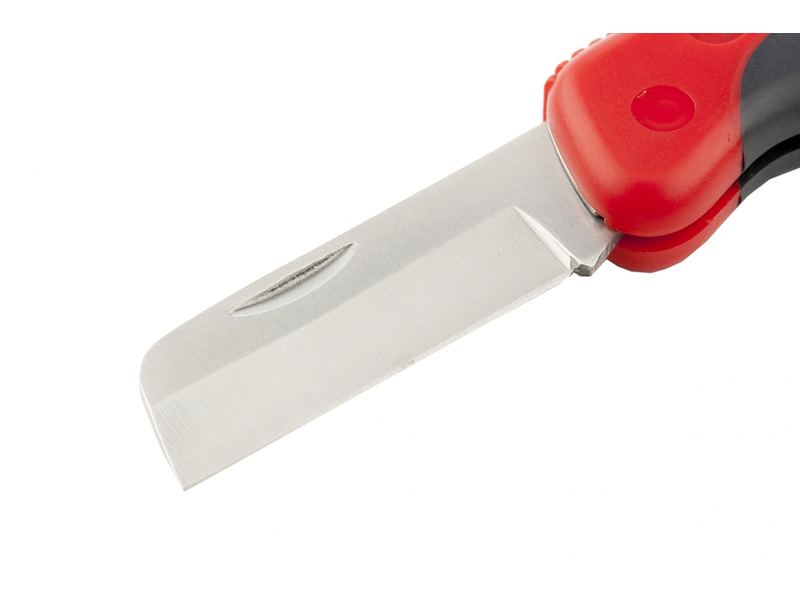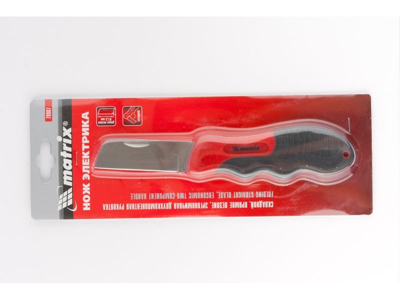 Складной нож электрика Matrix 78987 с прямым лезвием и эргономичной двухкомпонентной рукояткой используется для рассечения проводов и снятия с них изоляции. Прямое лезвие длиной 60 мм удобно для работы в стесненных условиях. Инструмент предназначен для электромонтажных работ, подходит для бытового применения.