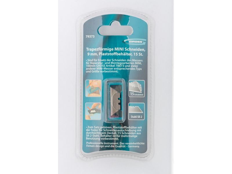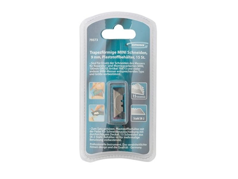 Трапециевидные лезвия Gross МИНИ 79373 шириной 9 мм и длиной 28 мм, 15 шт. в пластиковом пенале, предназначены для установки в монтажный нож Gross 78873. Используются при проведении ремонтных и отделочных работ для разрезания бумаги, картона, раскройки линолеума или обоев.