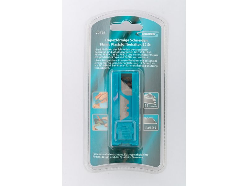 Трапециевидные лезвия Gross 79376 шириной 19 мм и длиной 61 мм, 12 шт. в пластиковом пенале, — сменные элементы для монтажных ножей Gross соответствующего типоразмера, кроме арт. 78873 и 78885. Они предназначены для резки бумаги, картона, кожи, линолеума. Пригодятся во время ремонта, отделочных работ, а также могут использоваться для творчества.