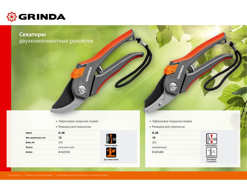 Все секаторы GRINDA являются прочными, долговечными и удобными изделиями, обеспечивая комфортный и лёгкий рез. Они выполнены из высококачественных материалов гарантирующих долгий срок эксплуатации.