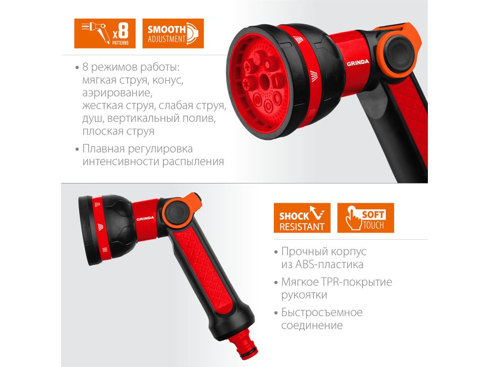 GRINDA N-8, 8 режимов, пистолет поливочный двухкомпонентный с регулятором напора