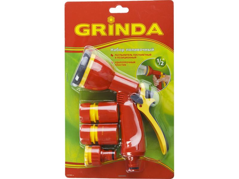 Набор GRINDA поливочный: Распылитель пистолетный 8 позиционный, соединитель 1/2 , соединитель 1/2 с автостопом, адаптер внешний 1/2 -3/4