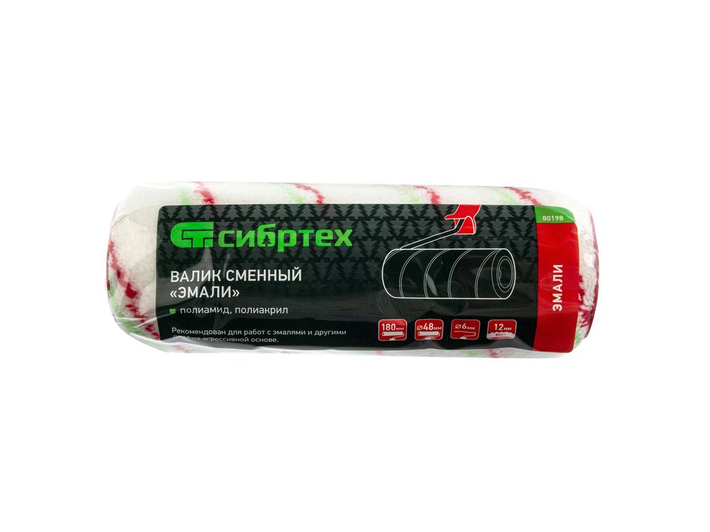 Сменный валик Сибртех «Эмали» 80198 с ворсом 12 мм из полиамида и полиакрила, размером ролика 180 х 48 мм, под ручку 6 мм, подходит для проведения малярных работ с любыми типами лакокрасочных материалов, даже содержащих агрессивные вещества. За счет ворса средней длины подходит для поверхностей любого типа. Рекомендован для работ с эмалями.