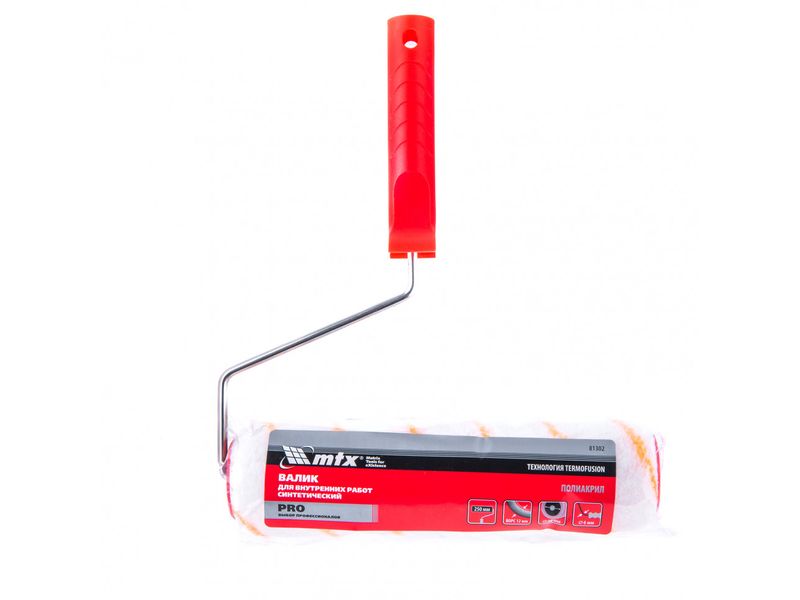 Синтетический валик для внутренних работ MTX PRO 81302 с ворсом из полиакрила 12 мм, шириной ролика 250 мм, диаметром 48 мм, ручкой 6 мм, предназначен для окрашивания больших площадей. Он позволяет окрашивать среднегладкие и шероховатые участки — стены, потолки, деревянные поверхности.