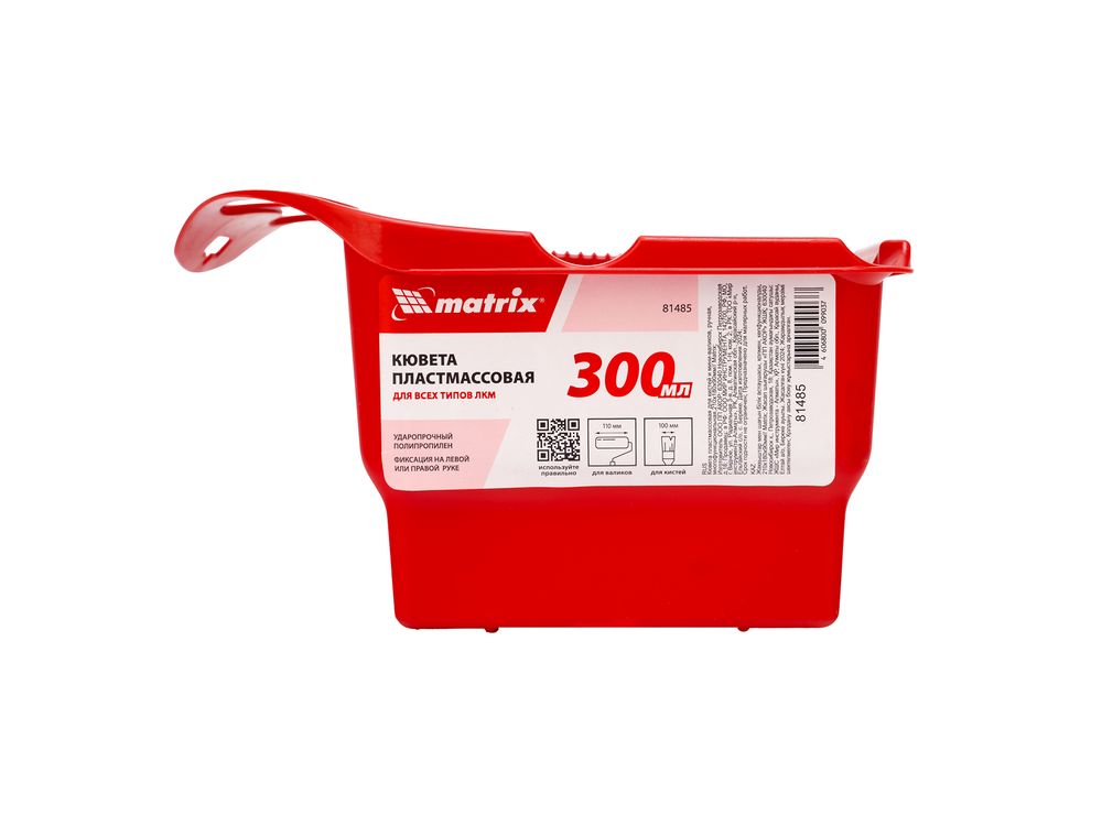 Ручная пластмассовая кювета для кистей и мини-валиков Matrix 81485 размером 210 х 180 х 90 мм и объемом 300 мл — многофункциональная емкость, существенно облегчающая процесс нанесения лакокрасочных материалов. Эргономика кюветы позволяет прочно удерживать ее в руке и работать со всеми типами ЛКМ в труднодоступных местах, при этом можно пользоваться сразу несколькими малярными инструментами: мини-валиками и кистями.