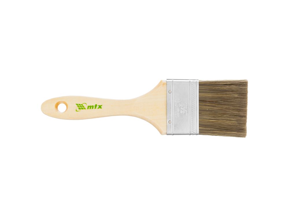 Плоская кисть MTX «Евро» 83080 шириной 2,5, с деревянной ручкой, имеет смешанную щетину и оптимальна для нанесения средств защиты древесины (пропитки, грунтовки, антисептиков, морилки). Сочетает все преимущества искусственной и натуральной щетины благодаря оптимальной комбинации натуральных и искусственных волокон. Обладает высокими краскообменными качествами: благодаря натуральной щетине в составе кисть хорошо впитывает и отдает краску. Инструмент подходит для профессионального использования.