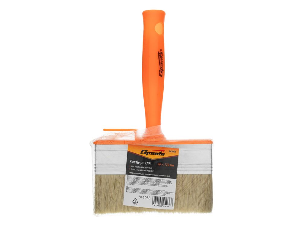Кисть-ракля Sparta 841068 толщиной 30 мм и шириной 120 мм, с натуральной щетиной, пластмассовыми корпусом и ручкой, используется для малярных работ на участках большой площади, поэтому удобна для обработки стен, потолков и фасадов. Натуральная щетина устойчива к химическому воздействию, поэтому не деформируется и сохраняет упругость при работе с ЛКМ на водной основе, грунтовками, масляными красками и клеящими составами.