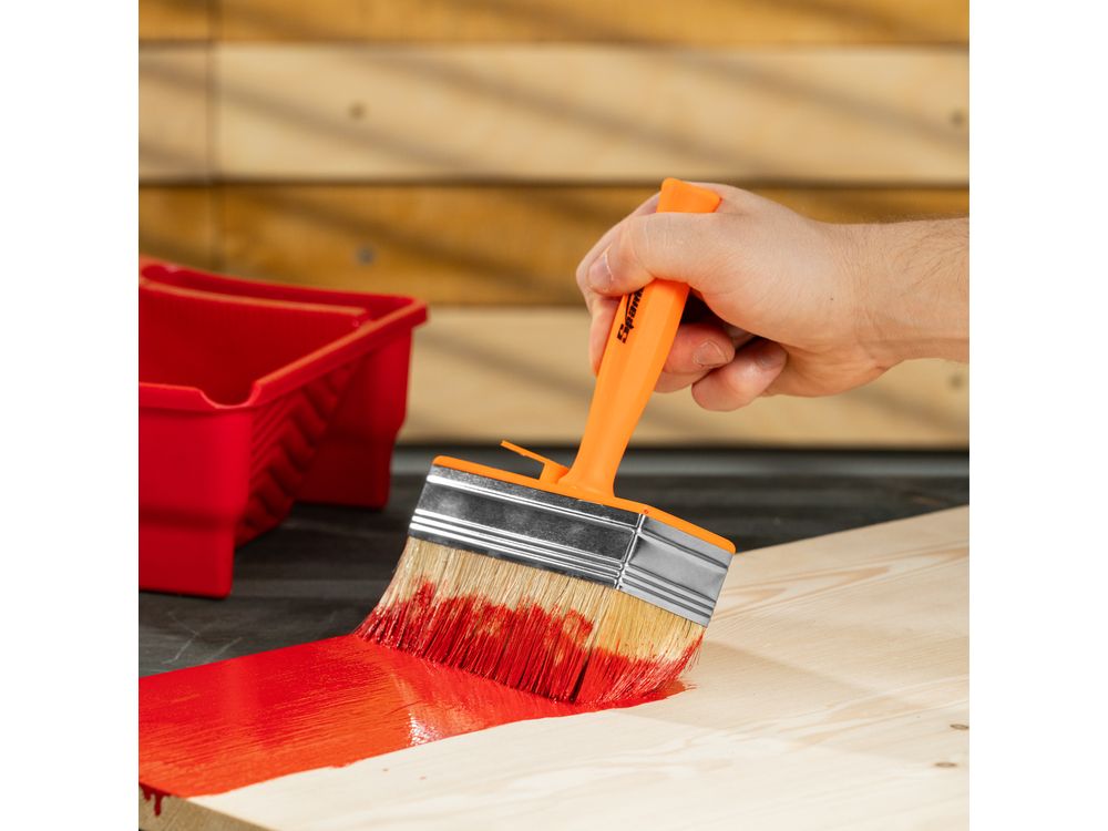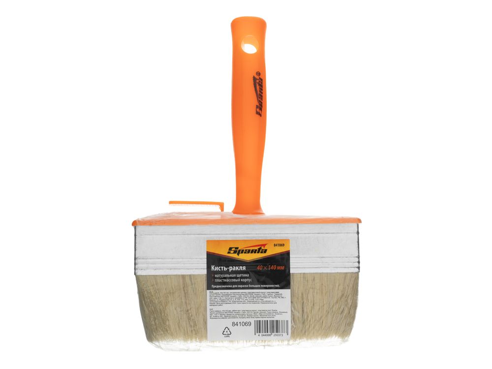 Кисть-ракля Sparta 841069 толщиной 40 мм и шириной 140 мм, с натуральной щетиной, пластмассовыми корпусом и ручкой, используется для малярных работ на участках большой площади, поэтому удобна для обработки стен, потолков и фасадов. Натуральная щетина устойчива к химическому воздействию, поэтому не деформируется и сохраняет упругость при работе с ЛКМ на водной основе, грунтовками, масляными красками и клеящими составами.
